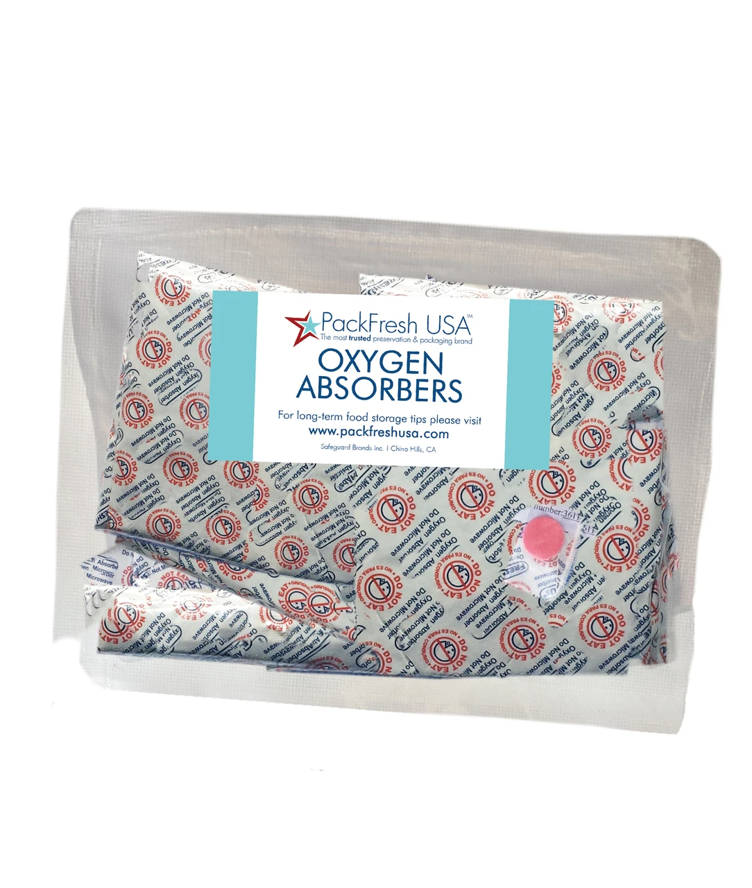 1000cc Oxygen Absorbers 10pk These 10000cc Oxygen Absorbers are guaranteed to absorb at least 180% of their rating, giving you a buffer of safety. Each package contains an oxygen indicator to guarantee freshness. Use in Mason Jars and Mylar bags. Features Absorb 180-300% of their rating as a safety buffer Work in Mason & Kilner jars and Mylar bags Oxygen indicators included ensuring freshness – a Shade of Pink or Red indicated it is ready to use, The indicator will turn dark blue when oxygen is present. Specifications: Includes: 10x 1000cc Oxygen Absorbers, Oxygen Indicator Made by Packfresh USA Click Here for How to Use Oxygen Absorbers in Other Containers Click Here for How to Use Oxygen Absorbers in Mason Jars Click Here for How To Seal 5 Gallon (18.9) Mylar Bags Click Here for How to Seal Mylar Bags (Quart or Gallon Size)(346ml or 3.L) (SSL-1000)