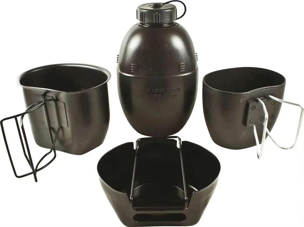 4 Piece Crusader Cooking System Black Compact Army Crusader Cooking System made from quality Stainless Steel with a sleek black PTFE finish which means it’s even easier to clean. Nests together for ultimate space saving. Boil water in under 6 minutes & heat up MRE’s with ease. Hold water in the bottle for later and nest the cups & cooker around the bottle until you need it. Light & easy to use, great for hiking & camping. Features: Cup & Cooker made from Quality Stainless Steel Classic Black PTFE Finish – Easier to Clean Constructed of high-grade stainless steel. The cup canteen is designed to fit beneath the NATO water bottle as part of the BCB Complete Cooking System. Crusader Cooker: An innovative new solid and gel fuel field cooker. Designed to meet the changing requirements of the future combat soldier. An integral folding arm allows the cup to fit securely over a fuel crucible where gel fuel or solid hexamine fuel blocks can be lit. A small slot provides efficient air intake whilst the walls of the cooker provide shielding against the wind. In transit, the cooker nests neatly and compactly beneath the cup. Boils 500ml of water in under 6 minutes. Integrates with the British Military issue ’90 pattern water bottle and mug – water bottle fits inside the Cup Specifications: Volume: 750 ml (internal measuring scale) Includes: 1x Cooker, 1x Cup, 1x Mug, 1x Nato Water Bottle Size: 13.7 x 10.2 x 10cm Weight: 290g Materials (Water Bottle & Mug): Durable Thick Plastic Materials (Cup & Cooker): Stainless Steel with PTFE Finish (CN010)