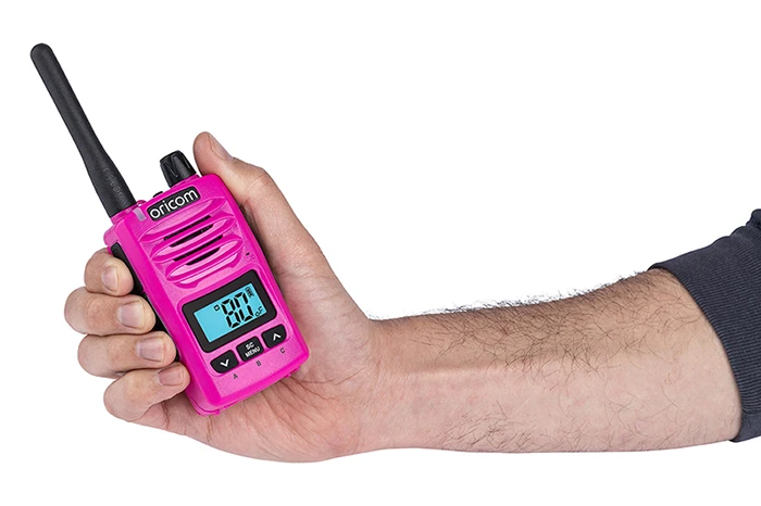 DTX600 Waterproof IP67 5 Watt Handheld UHF CB Radio Built tough, the Oricom Water & Dustproof 5 Watt UHF Radio is designed for the relentless outback. Featuring one of the largest backlit LCD displays in the Australian handheld radio market, the DTX600 is super compact and fits comfortably in the palm of your hand. Water and dustproof rated to IP67, this radio will go wherever you need it to, ensuring reliable communication no matter what the situation. Features: Up to 30 Hours Operating Time – Keep in touch with your mates all-day Water and dustproof IP67 rating – Built for tough work Compact radio with large backlit LCD display – No need to strain your eyes to see the screen even in low light Switchable RF power (high: 5 watt, low: 1 watt) – Extend the Life of your battery for when you need it 3 Programmable instant channel buttons – Quickly flick to the Channel you need 80 channels – Plenty of Choices Fast charge technology supplied with 240v and 12v adaptors – Get back on the road or take it with you to charge! Open/instant/priority scan Die-cast metal chassis for strength and durability Duplex (range extender) Signal monitoring Triple watch Audio scrambler 38 CTCSS and 104 DCS codes to block out unwanted signals High-capacity 2600mAh Lithium-ion battery pack (up to 30 hours operating time) 2.5mm jack socket with locking screw for optional accessories Optional portable roof mount magnetic antenna for increased range available here Specifications: Operating time: Up to 30 hours using Low Power, Up to 20 hours using high power with antenna. Duty Cycle, 5% transmit 5% receive & 90% Standby Includes: 1x UHF Radio, 1x Antenna, 1x Fast Charging drop-in cradle (Pod) (With mains adaptor & 12v Adaptor), 1x Rechargeable Li-ion Battery Pack (2600mAh), 1x Belt Clip Colour: Pink (DTX600PNK)