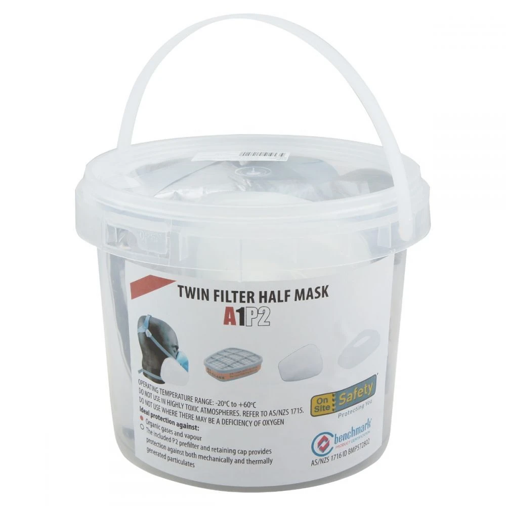 Ideal protection against: Organic gases and vapour Protection against both mechanically and thermally generated particulates Built using a TPR compound mask, the P2 RHM half mask is soft, pliable and durable. The exhalation valve is concealed behind the nose cone, reducing moisture buildup around your occular area. The cartridges easily click into the twin masks. The mask has adjustable length elastic straps to ensure you get the right fit. The crown can be adjusted in size as well. The mask is ideal to use in an operating temperature range of between -20o C to +50o C. All new filter cartridges are pre-sealed. Replacement cartridges are readily available. Recommended for bushfire smoke / dust, vapours, fumes, fibres etc Recommneded for hospital, laboratory and disease control Twin filter half mask Soft TPR mask Adjustable length straps Adjustable head band Easy to assemble with click and turn cartridges AS/NZS 1716 Spare Cartridges available Supplied in a sealed, re-sealable mini bucket container (RHMA1P2K)