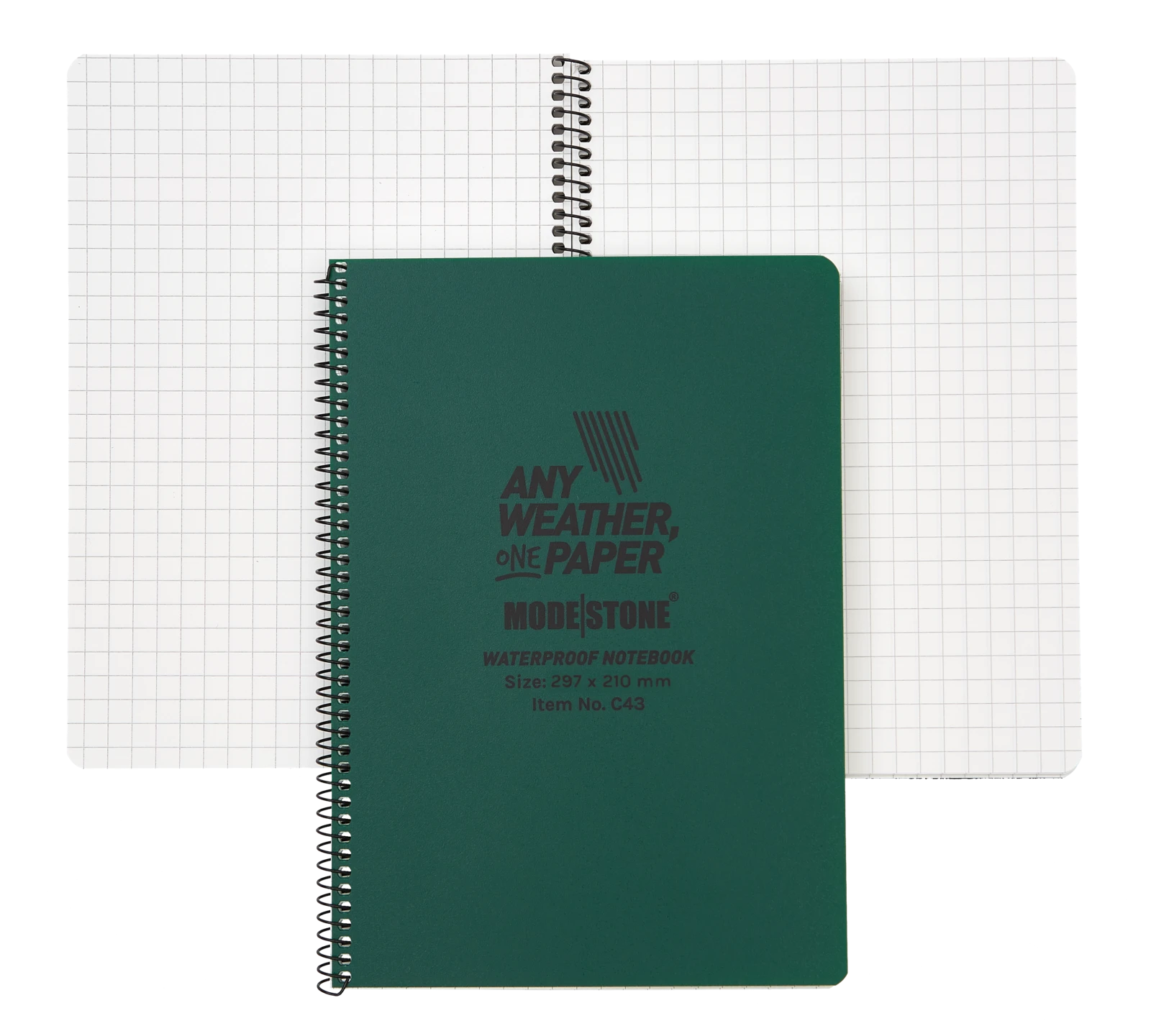 Modestone C43 Side Spiral Waterproof Notepad A4 210x297mm 50 Sheets Green Modestone notepads are a result of long-lasting product development. The idea of waterproof notepads started while the inventor, Kalle Kinnunen was serving in Finnish Defence Forces and his important notes from NCO School were destroyed by water. First problem was to find a perfect material for the pages and the Modestone stone paper was the utmost best option. It withstands water and grease, does not tear easily and won’t get eaten by insects. Modestone stone paper has another amazing feature: it allows you to write on it with an old key or even with a bullet. This feature allows you to write in tight spots without a pen. Modestone stone paper is also an eco-friendly choice. Stone paper is made from 80% CaCo3 and 20% HDPE. Features Waterproof Eco-Friendly Works with most Pens & Pencils – Can even use a key or bullet in emergency situations Specifications Size: 8.27 in x 11.69 in (210mm x 297mm) Page Pattern: 7x7mm grid Binding: Side wire-o Spiral Number of Pages: 100 Weight: 538 grams Number of Sheets: 50 Colour: Green (C43)