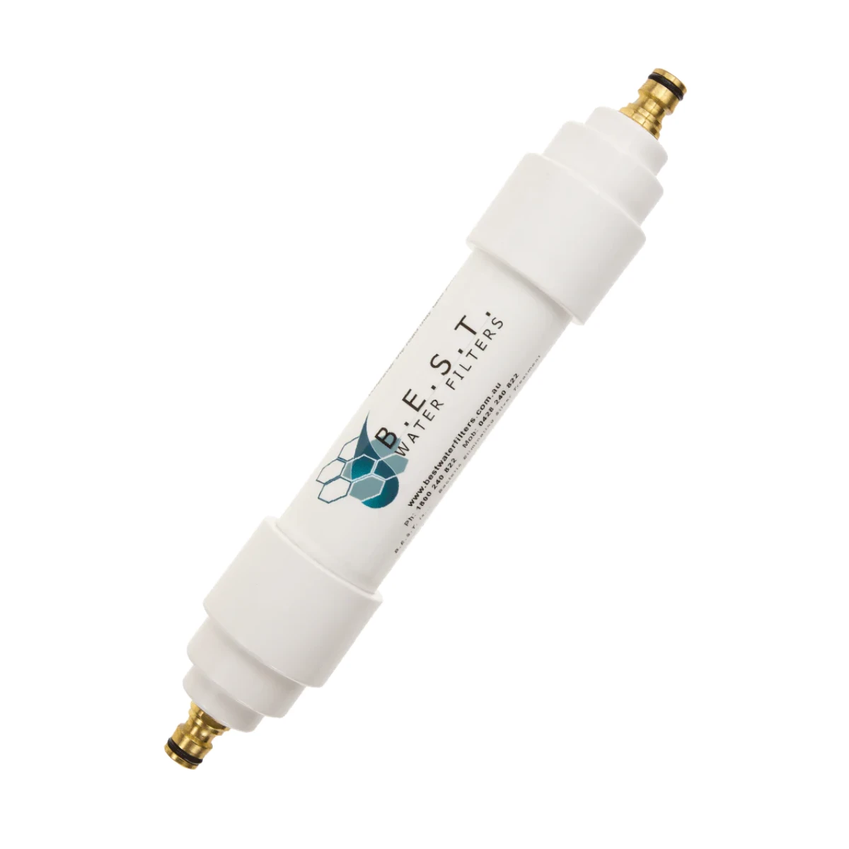 B.E.S.T. Caravan Water Filter – Brass Hose Connections This B.E.S.T. Inline is fitted into the main hose line that you lay out at the caravan park, which eliminates the need for alterations in your vehicle’s plumbing. DIY installation takes 2 minutes! This allows your filter to be installed in the main hose line running to your RV, which is used to fill your tanks or for when directly connected to the water supply while camping. Another reason B.E.S.T. is better than the rest is it’s back-flushing feature. Most other inline water filters promoted for RV/Caravan/Etc. use have a single flow direction. Our B.E.S.T. Inlines have no flow direction – meaning that when the flow of the water slows, simply turn it around; run town pressure water through in the other direction (flush this water to the ground – you will see the dirt flush away) then reconnect the filter into your water line). Features 1 Micron to stop Bacteria, Parasites, Crypto., Giardia, Cucsts. etc Chemical/Dirt Removal (Taste & Odour) – The B.E.S.T. Inline Water Filter contains a combination of quality carbons (chosen to suit Australian water conditions) to remove a broad spectrum of contaminants; Dual Membranes – 5 micron and 1 micron membranes are located at both ends of the B.E.S.T. Inlines to ensure fine filtration; “SilverSafe” Technology -Two full beds of “SilverSafe” are included to kill harmful bacteria and keep your B.E.S.T. Inline bacteria free during extended storage periods; Long Life (5000 Litres) – Due to lack of bacteria within the B.E.S.T. Inlines, this means there is no reason for ‘regular interval’ replacement. The reason all other water filters recommend a replacement time period (ie. every 6 or 12 months) is that the bacteria levels can increase to an unhealthy level. With B.E.S.T., we have eliminated this problem, so you replace ours when the carbon’s life has expired – not when the bacteria sets in! Reversible / Back-Flushable – The inside of the B.E.S.T. Inline water filter is a mirror-reverse, allowing it to be back-flushed to eliminate the build-up of contaminants on the membrane. Sealed – No cartridges to replace Compact – Designed to be compact, portable and portable for the travelling community. Lead-Free Brass Fittings – Machined in Brisbane, QLD! Specifications Dimensions (without packaging, with hose ends installed): 340mm x 60mm x 60mm Connection: 3/4″ bsp female threads. Inline is fitted with 3/4″ bsp x 12mm Lead-Free Brass, garden style, hose ‘click’ connector. Micron Rating: The B.E.S.T. Inlines have dual membranes on each end – a 5 micron, followed by a 1 micron. Flow Rate: 0 – 15 Litres per minute (dependant upon incoming pressure) (TIP – The slower water flows through all water filters, the better the contaminant removal will be. If you’ve got the time, do a slow fill into your tanks.) Max Pressure: Complies with Australian Standards – Holds 2100 kPa over a 15 minute period Min. Pump Pressure Required: Min. 35 psi or higher Min. / Max. Temperature: 1°C to 40°C B.E.S.T. Filter Life: There is no time limit to replacing the B.E.S.T. Inline. (*See ‘The B.E.S.T. Features’ above.) The carbon is rated to treat a minimum of 5,000 Litres of chlorinated water. (This is rated on chlorine being added at the maximum allowable level in town water supplies.) (322HB)