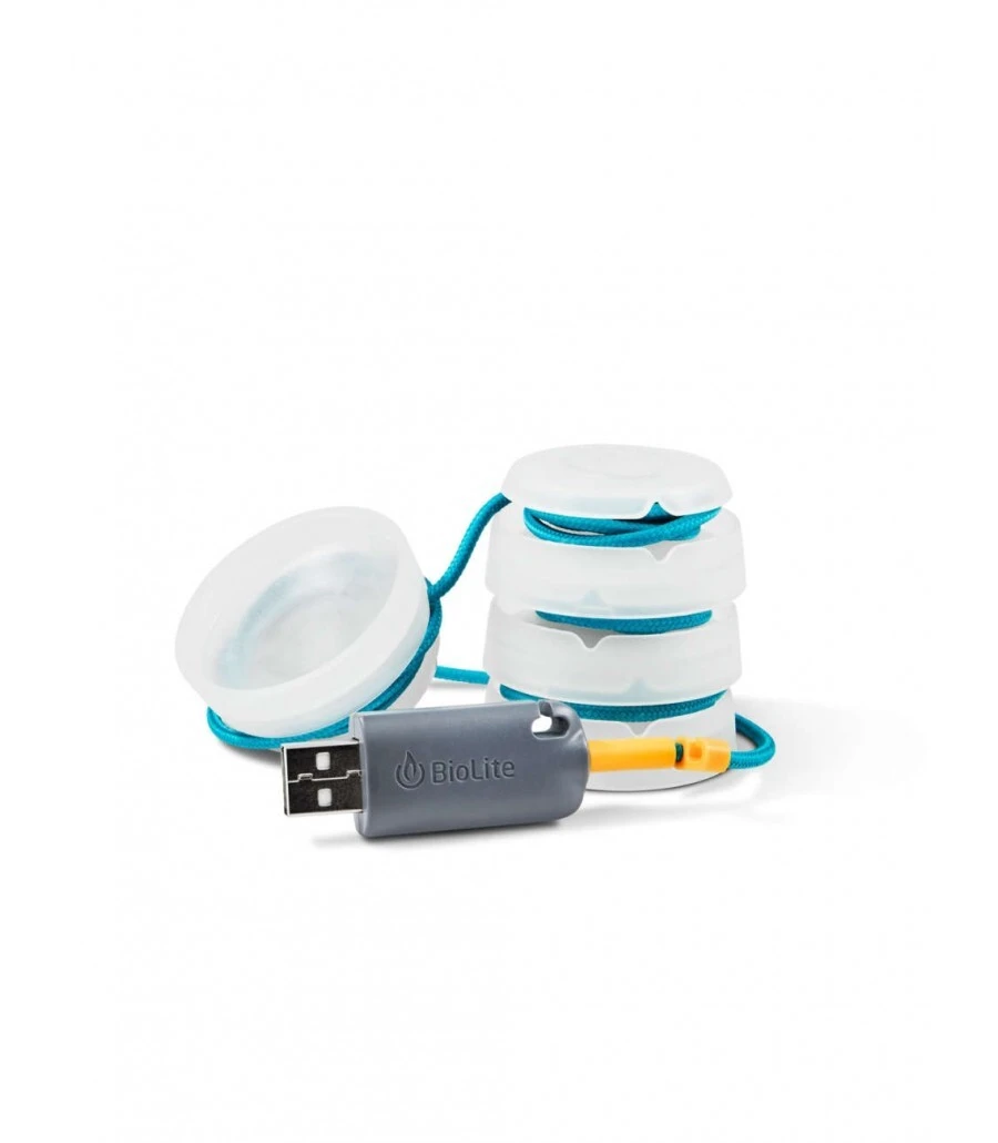 BIOLITE SITELIGHT STRING Containing four lights per string, the SiteLight String can light pathways, campsites, and tents with 150 lumens. Set on 3 metres of cord and daisy-chainable, power it with the Biolite TraveLight or Charge series or any USB source with included adapter. FEATURES 3 m of Cord – Four lights per strand with 53.3 cm between each light Daisy Chain Output – Connect additional strands or mix and match with other Biolite SiteLights Cord Stabilizers – Assists in hanging over branches Power/Daisy Chain Input – Power via USB using included adapter or connect to TraveLight or Charge series. In the Box – SiteLight Mini, USB Power Adapter, Instructions Stackable and collapsible designs make each set ultra-portable (SLB0200)