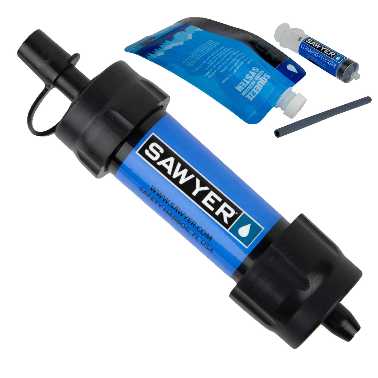 Sawyer Mini Water Filter Sawyer MINI weighs only 56 grams, fits in the palm of your hand, and provides 0.1-micron absolute filtration — removing 99.99999% of all bacteria, such as salmonella, cholera and E.coli, and removing 99.9999% of all protozoa (such as giardia and cryptosporidium). Simply attach the easy-to-use MINI to the included drinking pouch, use the included straw to drink directly from a water source, connect it to hydration pack tubing, or screw it onto standard disposable water and soda bottles. Rated up to 100,000 filtered gallons of water (378,541 litres), the award-winning MINI is perfect for everything from camping with the kids to travelling abroad where tap and bottle water cannot be trusted to kitting out your emergency go-bag. Features 0.1 Micron Absolute Filtration The Sawyer Mini contains a high number of tiny ‘U’ shaped hollow fibre micro-tubes that trap contaminants while allowing decontaminated water to freely pass through at a high flow rate — eliminating the need to store water and reducing the possibility of water contamination after the filtration process. The Sawyer MINI is certified for 0.1-micron filtration, meaning there is no pore size larger than 0.1 microns in size. This makes it impossible for harmful bacteria (like salmonella or leptospirosis), protozoa, or cysts like E. coli, Giardia, Vibrio cholera, and Salmonella typhi to pass through the filter. All Sawyer water filters meet or exceed Environmental Protection Agency (EPA) recommended removal rates. Rated to filter up to 378,541 litres The MINI’s filtering membranes are sturdy enough to withstand backwashing using the included syringe, restoring up to 98.5% of the filter’s flow rate. The MINI can be cleaned and reused almost indefinitely with no expensive cartridges to replace… ever. We recommend backwashing and sanitizing the filter after every outing for optimized use. Great for outdoor recreation, hiking, camping, scouting, domestic and international travel, and emergency preparedness the Sawyer MINI gives you a number of ways to access clean water. Simply fill up the included reusable pouch at any water source, screw the filter onto the pouch, and drink directly from the filter or squeeze water into a water bottle. You can also drink directly from water sources with the included straw. For even more versatility, screw the filter onto most standard disposable water or soda bottles, or attach it inline on hydration packs (sold separately). Versatile Can be used on any standard 28 mm threaded bottle or pouch Tested Quality The Sawyer MINI filter provides higher levels of water filtration while also outlasting other personal filters on the market. All of these filters are air tested three times before leaving Sawyer’s production facility to ensure that no pathogens can slip through our filter fibres, a claim that no other water filtration company can make. Compact & Lightweight With a total field weight of only 56 grams, the compact MINI rolls up into its included collapsible mylar pouch to take up minimal space in your pack and won’t weigh you down. Specifications Sawyer Mini Kit Includes: 1 x Sawyer MINI Water Filter with Tip Cap, 1 x 0.5 Litre Reusable Squeeze Pouch, 1 x 18 cm Drinking Straw, 1 x Cleaning Plunger (Syringe) Longevity: Up to 100,000 Gallons (378,541 Litres) Dimensions: 13.5 cm (H) x 3.5cm (W) x 3.5cm (L) Filter material: fibreglass; Filter membrane: a membrane made of U-hollow fibre pores with a maximum of 0.1 micron Weight: 57 g; Removes: 99.99999% of Bacteria, Protozoa, E. Coli, Giardia, Vibrio cholerea, Salmonella Typhi, Leptospirosis, and microplastics. Recommended Use: all kinds of hiking, fishing, kayaking, trips, camping, emergency preparedness and more. (P_SawyerMini)