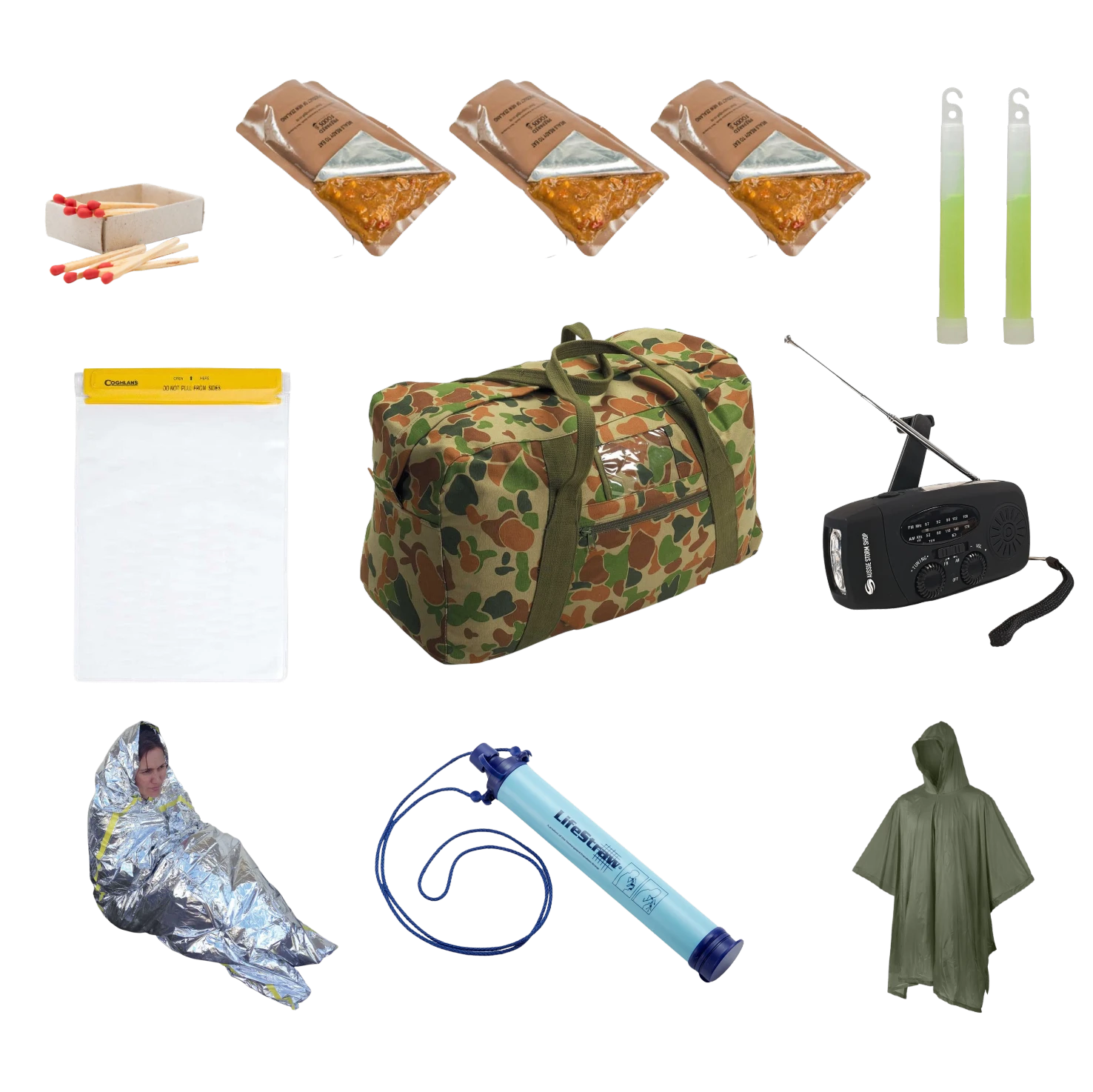 Bug Out Bag Survival Kit #1 The BOB #1 includes a great selection of gear to help you “Get out of Dodge”. The kit includes a quality Australian Army Echelon Gear Bag in Auscam with pleanty of extra space to add more of your own gear & clothing. In this kit you’ll find shelter, lighting, water filtration and even MRE food rations. The included wind up radio has a built-in torch and can also give your mobile phone a small emergency charge. This kit includes: 3x MRE Meals (Meals Ready to Eat) 1x Lifestraw Water Filter 1x Dymano Wind Up / Solar Radio with Torch 1x A4 Waterproof Document Holder 1x Assault 1 Molle Backpack 30L 2x 8 Hour Glowsticks 1x Box of Waterproof Matches 1x Army Poncho OD Green 1x Survival Thermal Space Blanket Please note: Some items may be substituted depending on availability. We can customize kits to your requirements. Contact us for more info. (BOB_1)