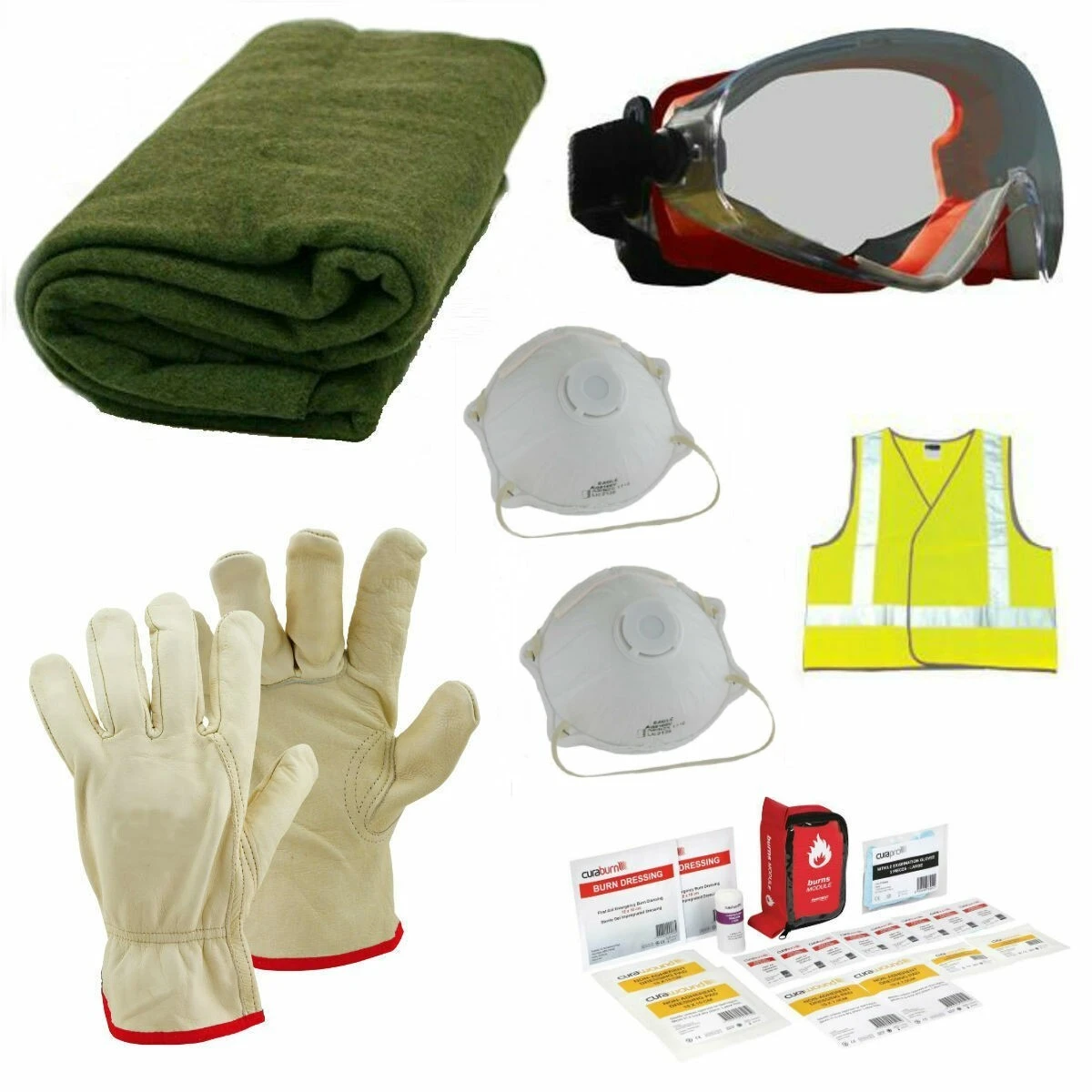Bushfire Kit 1 Person The Bushfire Kit 1 is designed to assist 1-2 people to evacuate their home during a bushfire. If you live in a Bushfire risk area this kit is a must have. Every home should have an emergency kit. Suitable for: Personal use at home or in the car Work place & work vehicles Schools, Universities Councils, Emergency Services Remote Areas & Field Use Kit Contains: 1x Large Personal Bush Fire Protection Blanket Approx. 2 x 1.6 metres: – Protection from radiant heat during a fire front. Designed specifically for bush fires (colour may vary) 1x Burns First Aid Kit: – A Complete first aid kit desiged specifically for burns & heat wounds. 1x 2-Pack Respiration Masks (P2 Compliant): – Helps respiration during smoke hazards. 1x Pair of Leather Gloves: – Keep your hands safe when dealing with hot items. 1x Pair of Heat Resistant Fire Fighting Goggles: – High quality anti-fog goggles that protect your eyes from smoke and heat. Designed by Firefighters for Firefighters. 1x Yellow Reflective Hi Visibility Vest: – Be seen during and after the fire hazard. 1x Lightweight Annodized High Decibel Signal Whistle – Very loud signal whistle, small and compact for your pocket or attach to keys. We recommend storing this kit in a container or a duffle bag so you can “grab & go”. * Please Note: This kit is designed only to assist with safe evacuation from potential bushfire situations and is not designed to assist with fighting fires. All households should a have a fire action plan. Please see you relevant State Fire and Rescue Authority to find out more about developing an effective fire action plan. * Some items may be different to the photo due to availability. We can customize kits to your requirements. Contact us for more info. (BushfireKit)