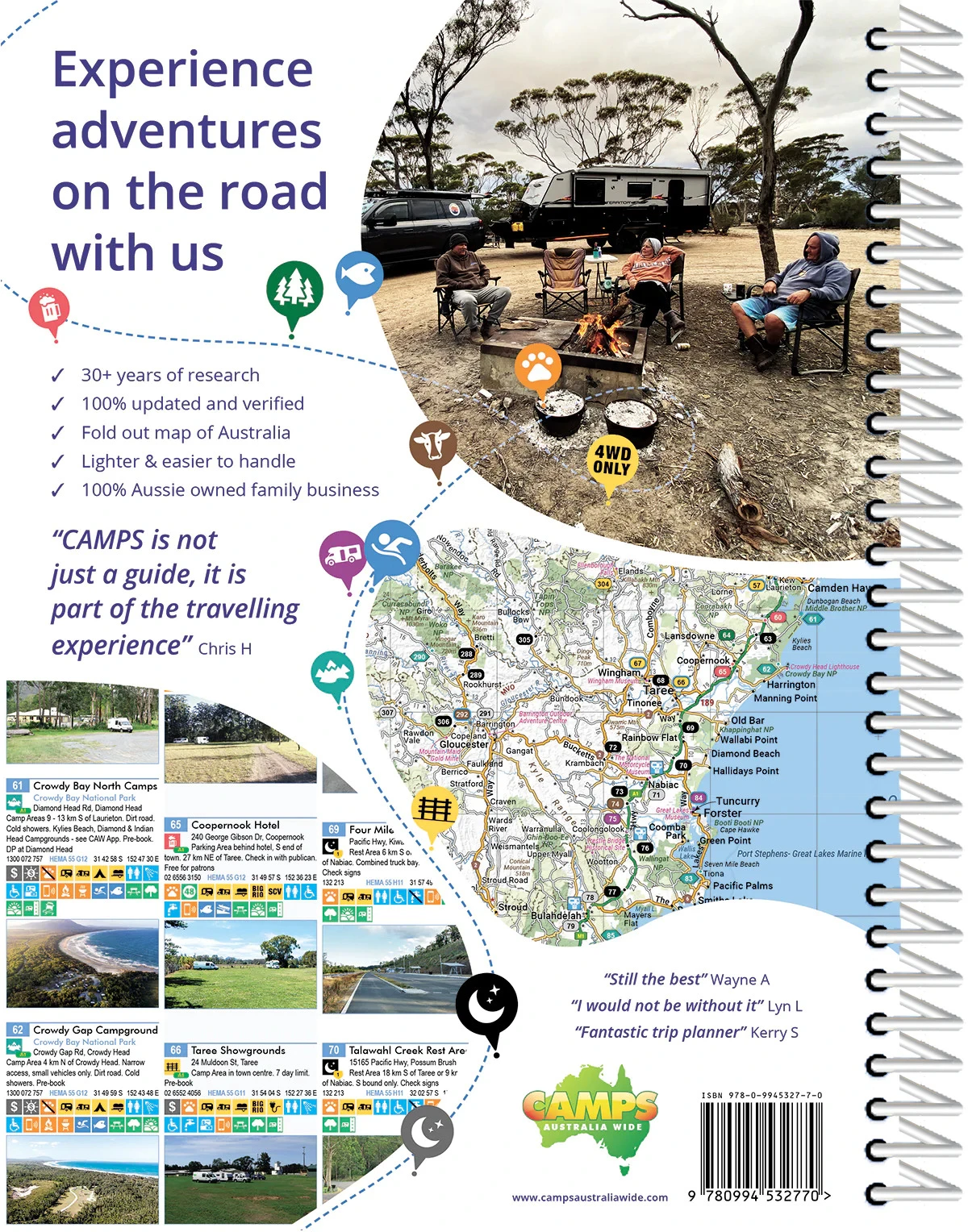 Camps 12 Easy to Read Edition Campsite Photos + Larger Maps Camps 12 is the only guide you will need for free and low-cost camping across Australia, featuring verified free and budget camps. Travellers can tell if a site is free or paid, national parks, state forests, showgrounds, pub stays, RV parks, stations and farm stays on the maps and listings. Only remote caravan parks that are important wayfinders or outback roadhouses are found in this streamlined edition. Features: Hard Cover, Spiral Bound, B4 Edition. More focus on free and low-cost sites than ever before Latest new campsites and public dump points – over 3,300 pet-friendly campsites Supported with updates and free access to the CAMPS App Sites that are pet friendly and/or have a public dump point are identified on the map, as well as the listing Known for generations as “The Traveller’s Bible” Every site is personally checked You can see site type on the map with coloured icons 30 plus years of research Aussie family-owned business Specifications: Edition: 12th Publication Date: 17/11/22 Number of Pages: 502 (spiral bound) Height: 345mm Width: 252mm Depth: 28mm Weight: 2.45kg (ISBN978-0-9945327-7-0)
