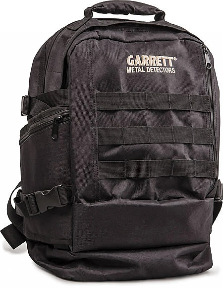 Garrett Sport Daypack This backpack is lightweight and a great size for day trips. Primarily designed for metal detecting but also great for hiking and day trips. Features Narrow Profile — Allows more freedom to move in rough terrain or dense brush than a full-size backpack Ample Storage — Two large zippered compartments will hold your spare search coil, extra pinpointer, snacks, gloves, and various field necessities. Large enough to hold an electronic tablet or laptop (up to 13″ size). Additional Storage — Two small side zipper pouches to hold finds and other small items; one 9-inch-deep zippered accessory pocket to keep important items close at hand; two internal pouches (one zippered) to keep items separated; and one padded divider pouch for notebooks or important papers. Exterior Webbing — MOLLE-type webbing grid can be used to attach accessories and carabiners to secure other items. Side Pockets — Ideal to hold water bottles or your finds. Side Straps — Use to cinch up your pack when you are carrying a light load, or secure your jacket and/or rain gear. Adjustable Fit — Shoulder straps, hip belt, and sternum strap can be adjusted to provide greater comfort for your load. Padded Back — Provides additional comfort for heavier loads. Includes luggage sleeve that allows daypack to easily attach to rolling luggage handles. Hideaway Hipbelt — Waist belt helps keep pack properly positioned during long hikes. Belt can be hidden away with Velcro flap on back of pack when not in use. Specialized Features — Internal sunglasses pouch at top of inner compartment; reinforced carrying handle; internal hook for attaching car key ring. Specifications Dimensions: Interior height: Approx. 35.5cm, Width: 29cm Material: Nylon, weather-resistant (1627200)