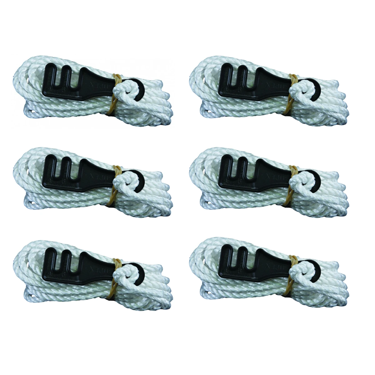 Guy Rope with Tensioner (6 pack) This guy rope kit includes a lightweight sliding tensioner and is an ideal replacement for your old guy ropes or to keep as a spare. Made from 6mm polypropylene UV stable rope, ensuring that despite constant exposure to the sun, it will not diminish in quality. The black plastic slide tensioner is strong and lightweight, perfectly suitable for hiking tents and lighter fastening applications but works great for camper trailers and caravans. Features 6 Pack Includes loop with galvanized metal rope splice clip 6mm polypropylene UV stable rope Made in Australia Specifications Length: 3.3 metres Weight: 67g (each) Includes: 6x Guy Ropes (38Q_6pk)