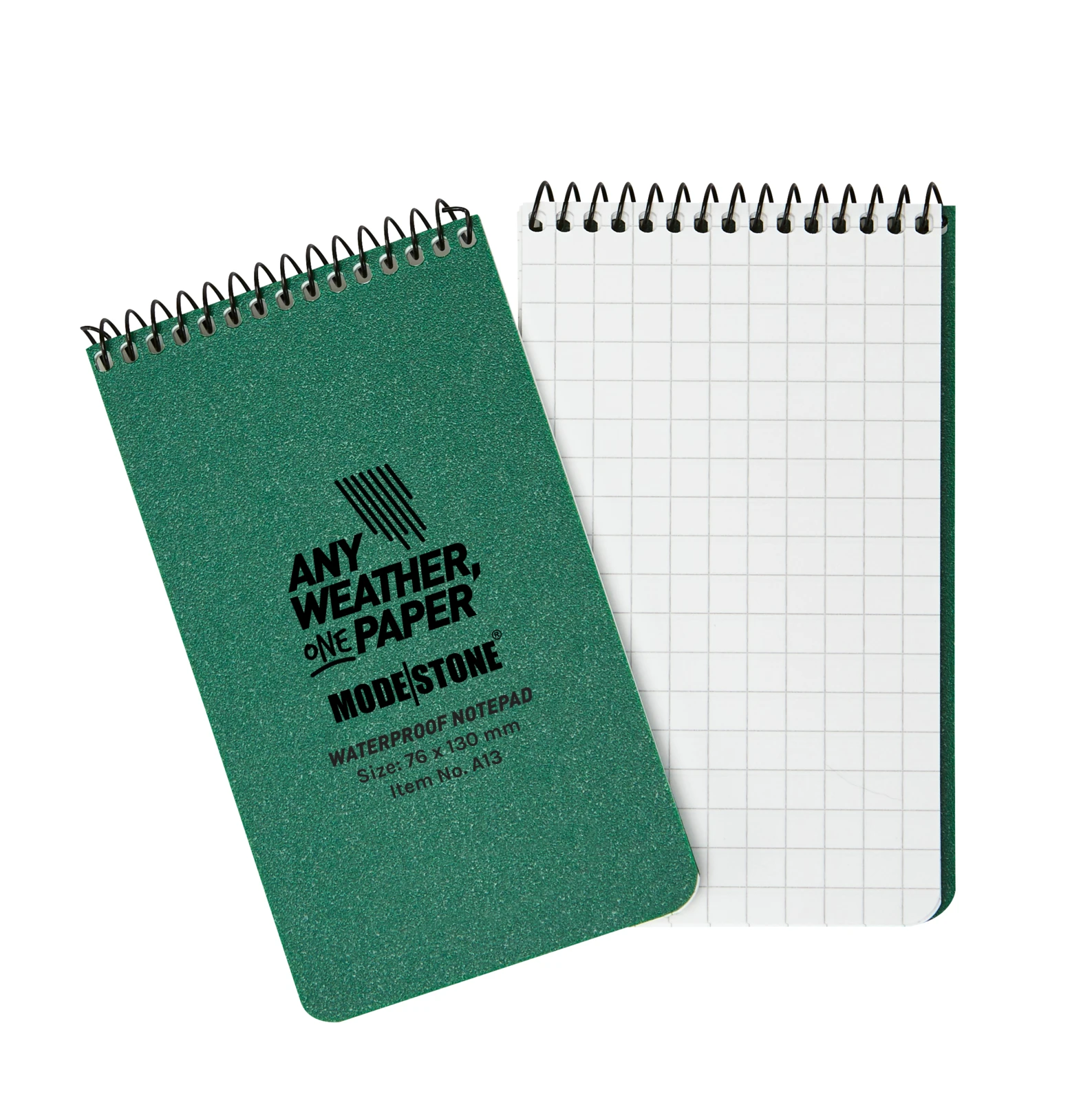 Modestone® notepads are a result of long-lasting product development. The idea of waterproof notepads started while the inventor, Kalle Kinnunen was serving in Finnish Defence Forces and his important notes from NCO School were destroyed by water. First problem was to find a perfect material for the pages and the Modestone® stone paper was the utmost best option. It withstands water and grease, does not tear easily and won’t get eaten by insects. Modestone® stone paper has another amazing feature: it allows you to write on it with an old key or even with a bullet. This feature allows you to write in tight spots without a pen. Modestone® stone paper is also an eco-friendly choice. Stone paper is made from 80% CaCo3 and 20% HDPE. Outer Colour: Green Pages colour: White Size – 3 in x 5 in (76mm x 130mm) Page Pattern – 7x7mm grid Binding – Top wire-o Spiral Number of Pages – 100 Weight – 0.13 lbs (60 grams) Number of Sheets – 50 (A13)