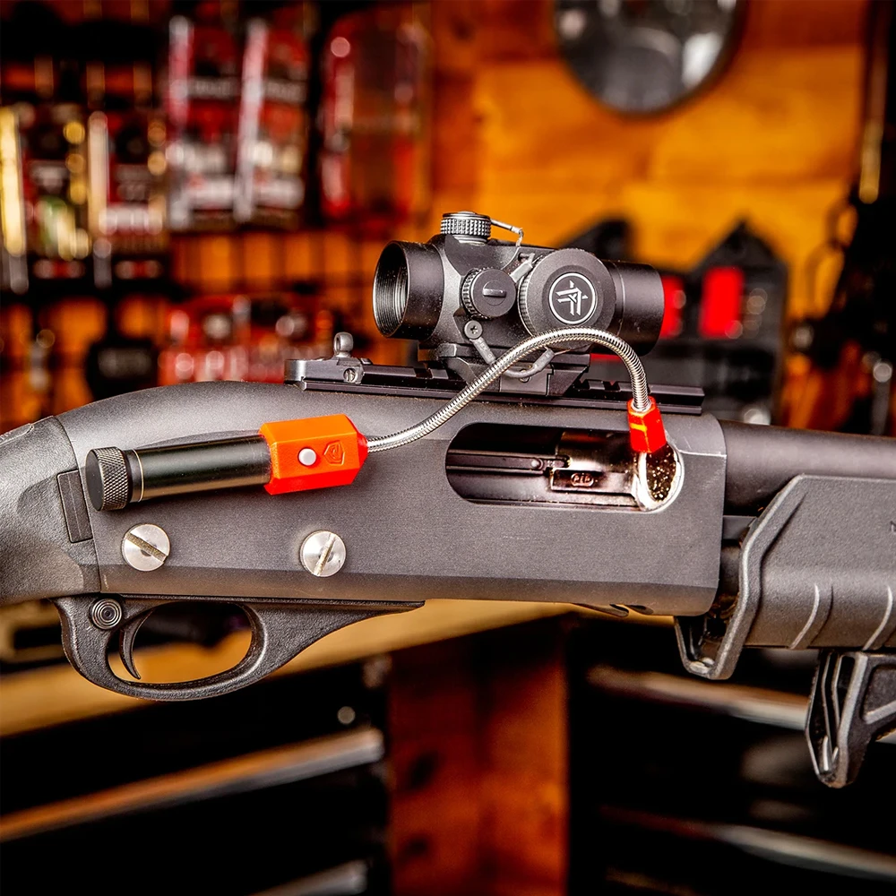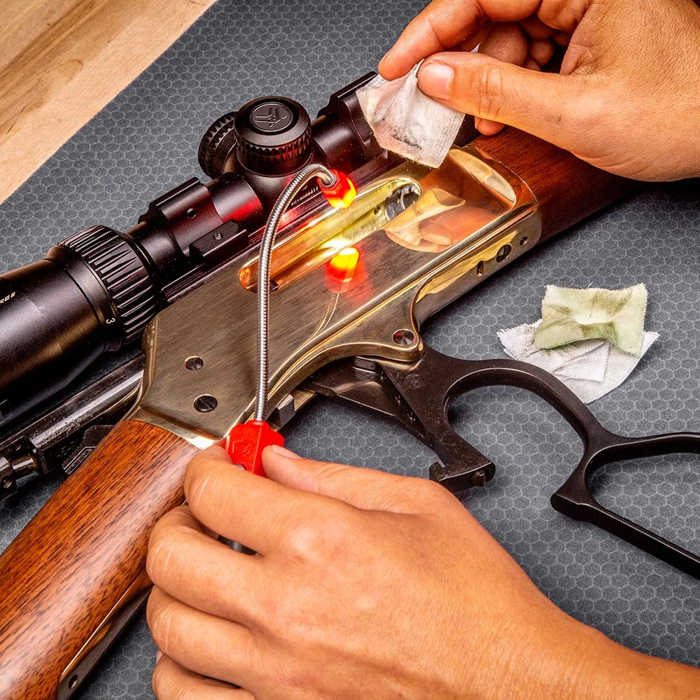 Real Avid Magnetic Bore Light The Real Avid Magnetic Bore Light lets you light your bore while keeping both hands on your gun. It clings to your barrel or action so you can control your firearm with both hands and get a great view into your bore, chamber or action. Features: 5″ Flex Neck Positions Light onto Hard-To-Reach areas Durable Button On/Off Switch Strong Magnet Bright LED Beam Aluminium Battery Housing Specifications: 1x AAA Battery (Not Included) Flexible Neck length: 12.7 cm (AVBR101-B)
