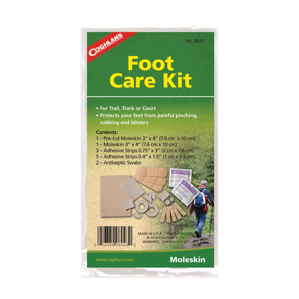 Moleskin Foot Care Kit for Blister Protection This foot care kit contains everything needed to treat common foot problems associated with hiking. The included moleskin protects feet from painful pinching, rubbing and blisters, and the antiseptic swabs help clean and prep the affected area. Features All-in-One Kit to treat Blisters, Pinching, Rubbing Hikers First Aid Essential Specifications Includes: 1 piece 7cm x 10cm pre-cut moleskin, 1 piece 7.6cm x 10cm moleskin 2 antiseptic swabs, 3 – 2cm x 7cm adhesive strips, 5 – 1cm x 3.8cm adhesive strips. (COG8043)