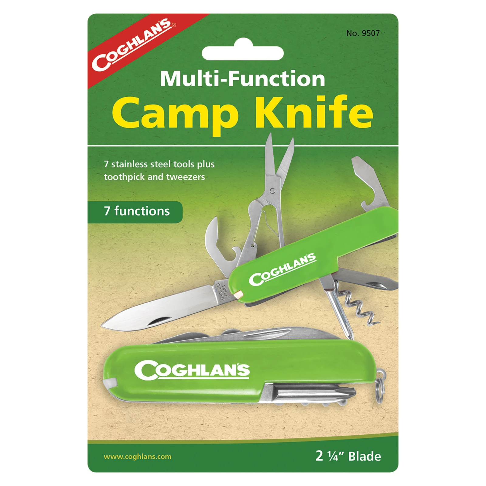 Pocket Knife Multi-Function Enjoy the benefits of the well-known pocket knife brands without the expensive price tag. This budget-friendly Coghlan’s Multi-Function Camp knife features a handy keyring to attach your tool to your keys, ready for when you need it or simply slip it into your pocket with its compact size. Not only that, it includes seven durable stainless steel tools that will cover your everyday situations and also your not-so-common issues that this Camp Knife tool can fix. Features Tools included: Large Fine Edge Stainless Steel Knife Blade Scissors Bottle Opener Flat Screwdriver Cork-screw Can Opener Phillips Screwdriver Toothpick Tweezers Keyring / Lanyard Ring Specifications Blade Length: 5.5cm Dimensions: 9cm x 1.5cm Weight: 71g (9507)