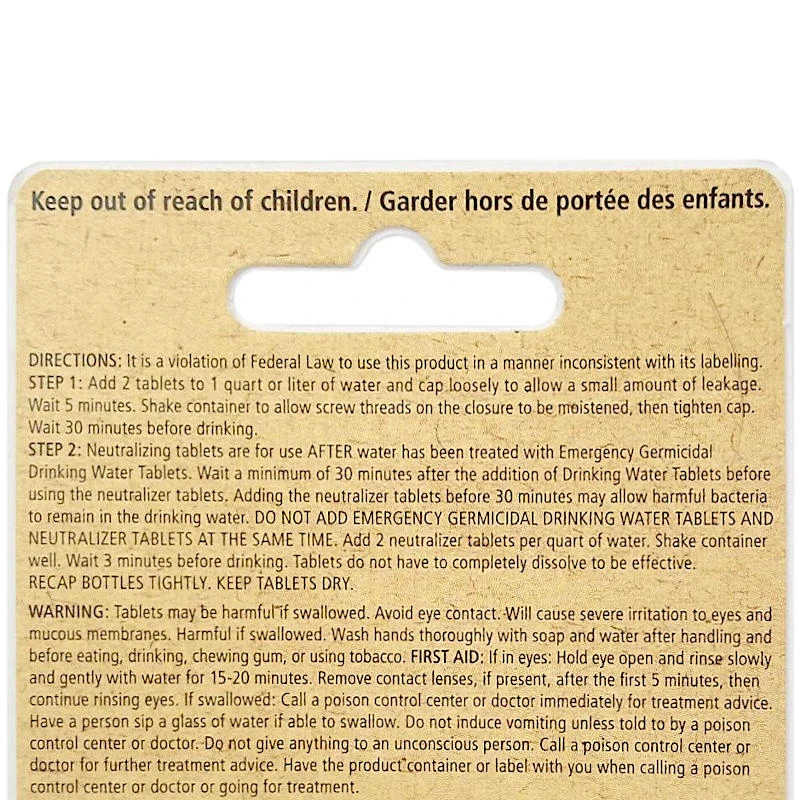 Two-Step Drinking Water Treatment For the emergency/survival wary among us, clean water is a non-negotiable necessity. Although these water treatment pills aren’t designed for sustained use (un-chemically treated fresh water is always preferable) these will work easily in a pinch and keep you healthy. Ideal for situations where you don’t have the option to boil water, these provide a discreetly passive way of purifying. Features Includes 50 tablets per bottle Proven effective against Giardia Includes Neutraliser – Removes Iodine Taste & Colour after Water has been treated with drinking water tablets Treats 25 Litres of Water Specifications Dimensions: Approx 5.2cm H x 2.3cm diameter (individual bottle size) Weight: Approx 80g Ingredients: Iodine-based compound Includes: 1x Bottle Emergency Drinking Water Germicidal Tablets (50 Tablets), 1x Bottle Neutraliser Drinking Water Tablets (50 Tablets) (9586)