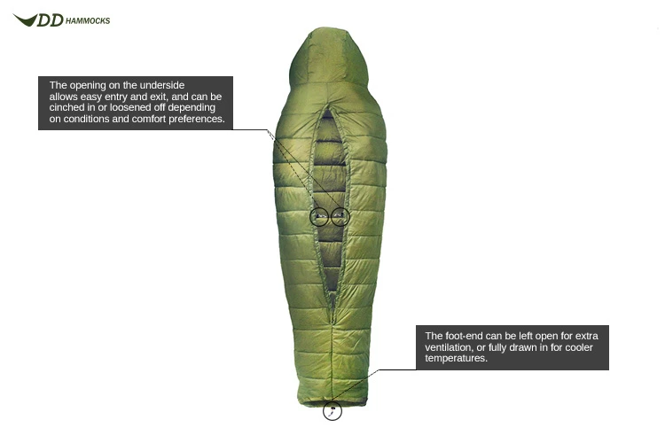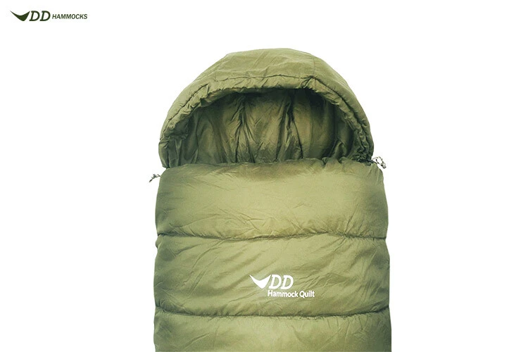 DD Hammock Quilt OD Green Comfortable & versatile 3-season hammock insulation. The DD Hammock Quilt makes an ideal comfort solution for spring-to-autumn camping. A lighter alternative to a sleeping bag, the quilt allows for easy and comfortable usage inside your hammock and compliments the DD Underblanket perfectly. The Hammock Quilt features a three-quarter length opening on the underside, to allow for easy entry and exit when sleeping in a hammock, with an integrated hood and foot covering. If it warms up, or you want to spread out some more, just loosen the drawstrings and the quilt opens up again! Features Optimum comfort level when used in temperatures down to 2°C with a DD Underblanket on your Hammock Lightweight Alternative to a Regular Sleeping Bag – ideal comfort solution for spring-to-autumn camping A three-quarter length opening on the underside, to allow for easy entry and exit when sleeping in a hammock Integrated hood and foot covering The underside opening features drawstrings around the perimeter – when pulled tighter, the quilt encloses around you. Open foot end and hood can be cinched in with drawstrings of their own – essentially turning the quilt into a sleeping bag that wraps around the whole body Ideal for keeping out an unexpected chilly breeze and retaining extra warmth until the sun rises Compact & Lightweight Specifications Size: Comfy for people up to 190cm Weight: 875grams Colour: Olive Green Material: Ripstop Nylon Quilt, filled with 200gsm Synthetic Silk Width at top: 128cm Width at Bottom: 92cm Length: 194cm Includes: 1x Hammock Quilt, 1x Compression Sack (DDHammockQuilt)