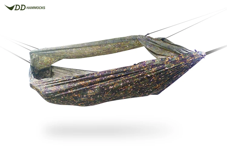 DD Hammocks DD Nest Hammock (Multicam) The DD Nest Hammock is covered head-to-toe in the DD Multicam pattern, designed to make sure you blend in perfectly to woodland environments. This hammock ensures the most covert campsite possible, whilst keeping all the time-tested comfort and features that a DD Hammock provides. With a similar design to our highly-regarded Frontline Hammock, the Nest Hammock swaps the integrated mosquito net for a full DD Multicam top shield; offering a spacious shelter from wind and insects, as well as any prying eyes. A fine-mesh window at the head end of the hammock gives a good outward view without compromising the camo-capabilities! Dual, breathable base layers keep things comfortable in warmer climates, whilst insulation such as a DD Inflatable Mat can be inserted between the layers in the chillier months. The DD Nest Hammock comes with 10m of suspension webbing pre-fitted, whilst 4 internal pouch pockets allow for easy storage of essentials and valuables. Want to lie in the open air? Just roll up the top shield and suspend it on the spreader poles above, or just remove the spreader poles entirely and flip the entire hammock over! The DD Hammock range is designed to be lightweight and built for easy travelling with comfort always in mind. The DD Nest Hammock is great for Campers who like to travel light or for Hiking adventures. Features Fully cloaked in DD’s own Multicam Camouflage pattern – a versatile and complex pattern that blends in seamlessly to a multitude of natural surroundings. Insect-proof mesh window at the head end Breathable, double-layered design with velcro tab closure – insert a partially-inflated Inflatable Mat between the layers in cooler weather to give extra insulation 2 x foldable lightweight 60cm-wide spreader poles and 4 x 1m lengths of elastic cord included, to suspend the cover 2 x double-sided zippers for easy open and close 2 x internal hanging loops for torches, glasses… 4 internal pockets to store small valuables – these can be used in any hammock set-up configuration! 4 tabs – 1 on each corner of the base – to peg out, to suspend equipment from or to fit a DD Underblanket Pre-fitted with 10m strong suspension webbing (5m each end) Includes Stuff sack Fully featured for covert camping. Specifications Size: 2.7m x 1.4m Colour: Multicam Weight: 1200g Includes: DD Nest Hammock – MC, 10m Strong Webbing, 4 x 1m Elastic Cord, 2 x spreader poles, stuff sack Weight limit: 125Kg (DDNestHammock-MC)