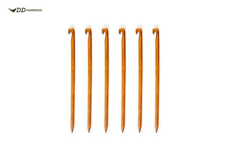 DD SuperLight Tent Pegs 6pk This extra set of 6 pegs allows you to add to the 4 already supplied with the DD Hammock SuperLight Tarp, so you can truly make the best of your DD tarp’s 19 attachment points! Got lots of setup ideas for your tarp, but run out of pegs? You’ll be amazed at what you can achieve with a few extra peg points – a tipi tent, a closed shelter or more Features 6 x strong yet ultra-lightweight silver ground pegs, with small hooks Suitable for use in fairly hard ground Specifications Size: 15.5cm x 4mm Colour: Copper coloured Weight: 8g each Includes: 6 x SuperLight pegs (DDSuperLightOrangeTentPeg)