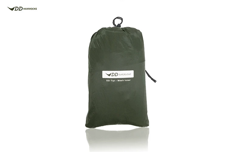 DD Tipi Tent – Mesh Inner 4 Person Keep you, your family and your gear bug-free with the DD SuperLight – Tipi – Mesh Inner. The Mesh Inner can comfortably sleep up to 3 adults, or a family of 4! The DD SuperLight – Tipi – Mesh Inner weighs in at an incredible 950g excluding pegs with a seriously small pack size for a product of this type. This is a perfect tent for any sort of adventure: from campsite weekends with the kids to lightweight backpacking. The fully waterproof floor, secured with 8 SuperLight Pegs, keeps you isolated from damp ground, whilst a SuperLight Tarp can be erected above, giving shelter from the weather. Features Spacious insect protection Lightweight and compact Suitable for 3 adults or a young family of 4 Super lightweight of 950g excluding pegs. Smallest possible pack size for a tent of this size. Easily set up in conjunction with a DD Tarp or optional Tipi Tent Walls are made from ultra-fine bug mesh with a fully waterproof 3,000mm PU-coated single-layer floor. Reinforced metal eyelets at the top of the tent, and in the centre of tent floor to slot your Tarp pole (purchased separately) SuperLight Pegs included for securing the floor. Specifications Dimensions: (Length) 320cm x (Width) 250cm x (Height) 200cm Packed size: 28cm x 16cm x 13cm Colour: Olive Green / Black Weight: 950g excl. pegs Includes: Mesh inner tent, SuperLight Pegs x 9, Stuff sack Please Note: For standalone use, we suggest purchasing either a DD Tarp Pole – XL Size or a DD Tarp Pole – 2.2m (Sold separately). When using with the DD Tarp Pole, we recommend removing the plastic foot at the base of the pole in order to slot it through the floor eyelet: this achieves the most secure set-up. The 2.2m pole is included with the optional DD Tipi Tent. Optional DD Tarp Pole 2.2m: Click Here Optional DD Tipi Tent: Click Here (DDTipiMeshInner)