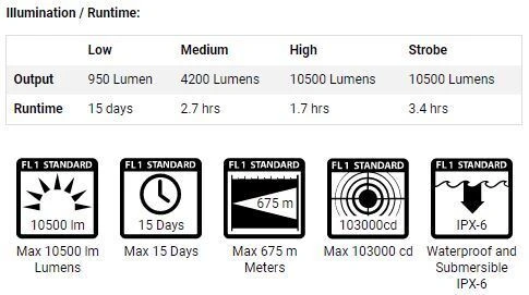 PowerTac Destroyer X10K 10,500 Lumen Rechargeable LED Flashlight Designed for Search & Rescue First Responders Ideal for large properties and fields Engineered with the latest cutting-edge technology, exceptional craftsmanship and unbeatable reliability. The Destroyer is designed to be the ultimate search & rescue handheld flashlight that produces an astonishing 10,500 lumens with an extra-long throw up to 675 meters that’s over 7 football fields! Ideal for professional first-responders, explorers or any other activities requiring a tremendous amount of illumination. Advanced thermal management with a built-in cooling fan and Type III anodized aluminium body make dissipates heat efficiently without overheating. A sealed, rechargeable 8-cell circuit-protected 18650 lithium-ion battery pack (replaceable) is integrated into the light to provide many years of dependable service. The X10000 Destroyer is very easy to operate, simply press the side button switch to turn on/off; then rotate the circular rotary ring surrounding the power switch to scroll through the 5 illumination settings (off, low, medium, high, strobe and SOS). Features: For the Professional user who needs unmatched light output Utilizes one CREE XHP70 and six CREE XM-L2 U2 high-power white LED that produces an amazing 10,500 lumens at its brightest and Strobe setting. Super-long 675 meters floodbeam throws with an impressive flood light and tight centre beam to illuminate objects at both long and close distances A simple, user-friendly interface utilizes a circular rotary ring to change lighting mode functions Digital-circuit control microprocessor maximizes battery life and monitors consistent light output performance. Built-in waterproof cooling fan for superior active heat dissipation (AHD) to maintain long uninterrupted use. Machined from aircraft-grade aluminium; Type III anodized finish O-ring sealed to IPX-6 waterproof standard. Stainless steel rings on both the head and tail-cap allow for ergonomic nylon shoulder strap application Advanced anti-slip knurling and matte style finish provide for a firm grip. Power switch for power on / off. Rotary switch for adjusting brightness levels / functions. Specifications: Battery pack: 8 cell 18650 (3400 mAh) rechargeable Li-ion sealed battery pack with protective circuit board LED type: CREE XHP70 and CREE XM-L2 U2 white LED. Length: 307 mm. Bezel diameter: 90.00 mm. Body diameter: 50.00 mm. Tailcap diameter: 50.00 mm. Weight: 3.1kg. (not including the shoulder strap and AC charger). Maximum output power up to 90W. Packaging: Portable high-strength aluminium case. Included Accessories: 1 AC charger and 1 high-quality nylon shoulder strap. Limited Lifetime Warranty (X10K)