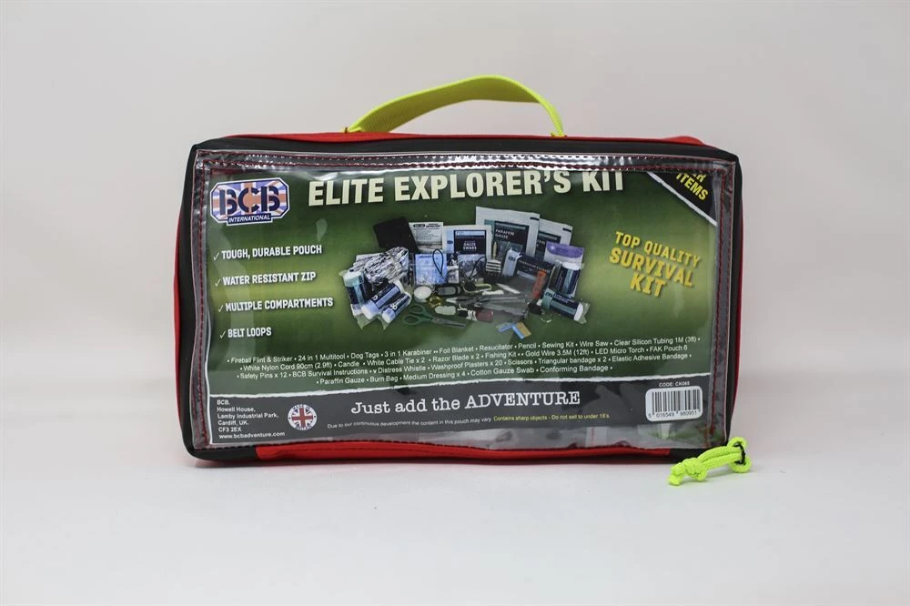 Elite Explorer’s Survival Kit The Elite Explorer’s Kit is the ultimate survival kit for the elite explorer! Jam-packed with tools, medical, fire lighting, and emergency signalling items. All packed inside a large vibrant red 500D nylon pouch with a waterproof resistant zip to keep your gear protected, which has an easy to find, hi visibility pull-tab. The pouch opens up to multiple foldout compartments which have clear view windows for ease of browsing your desired kit! Includes a carry handle on top and two belt loops on the rear. It has a large clear window pouch on the rear below the belt loops for quick easy access to survival/emergency instructions or to place a name tag etc. Made by survival experts. Contents: • Multi-tool • 3-in-1 Carabiner, Compass & Thermometer • Hypothermia Foil Blanket • Sewing Kit • Fishing Kit • Wire Bush saw • Distress Whistle • Fireball Flint Firestarter & Striker • LED Micro Torch • Clear silicone tubing 1m • Dog Tags • Resuscitator • Safety Pins • Single edged razor blade • White cable tie • Gold Wire Animal Snare 3.5 metres (12ft) • White Nylon Cord 3″ • Candle • Pencil • Survival instructions • Calico triangular bandage 90 x 127cm • No.8 medium dressing • No.9 medium dressing • Conforming bandage 7.5cm x 4m • Cotton gauze swabs • Elastic adhesive bandage 2.5cm x 4.5m • Paraffin gauze 10x10cm • First aid scissors • Burn bag • Assorted waterproof plasters (bandaids) • Lifesaver instruction leaflet All supplied in a weatherproof bag Specifications: Dimensions (Pouch Size): 26 x 14 x 7cm Weight: 850g Made in Great Britain Contents in this pouch may vary due to availability. (CK065)