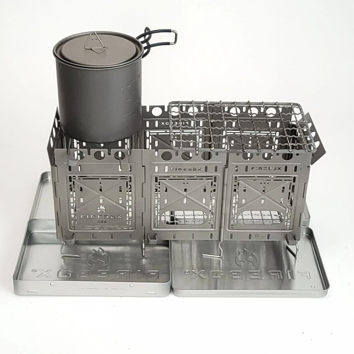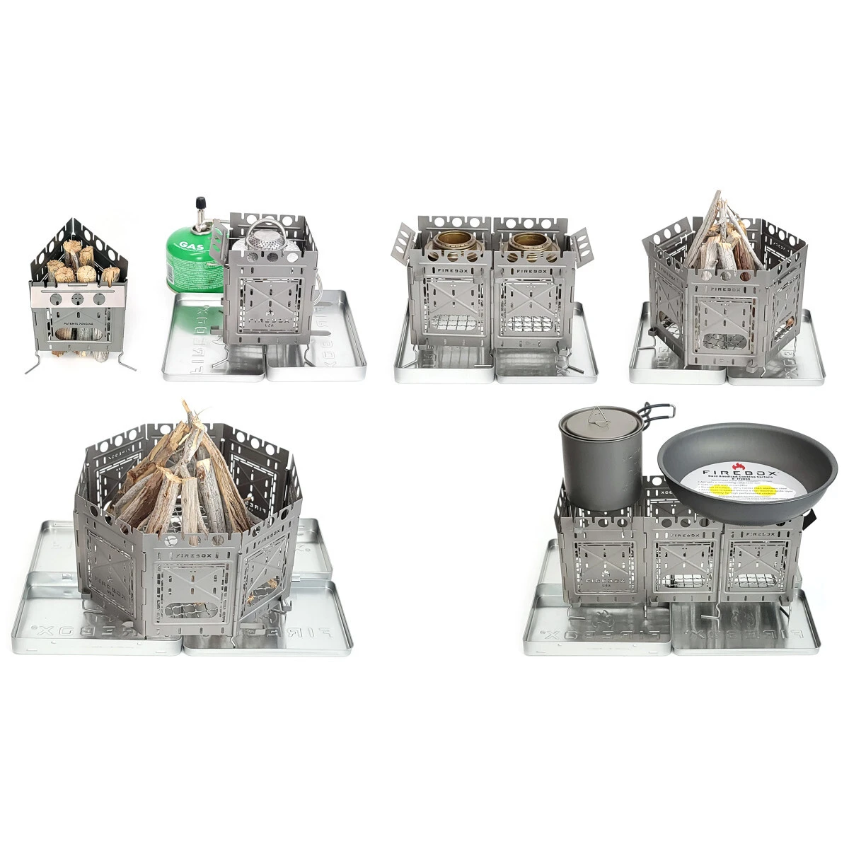 Firebox Freestyle Modular Stove (Choose Kit) The Newly introduced Firebox Freestyle Stove is a modular solution that uses a set of folding panels to shape-shift into everything from a compact 4″ stove to a full field kitchen, and a few options in between. Made with your choice of Stainless Steel or Titanium making it ultra-lightweight and durable. Use as a 4″ Camping Stove or a 3″ Triangular Torch Stove by itself. Or combine it with another Freestyle stove (Everything Kit) to add extra panels for larger cooking possibilities. The Triangular Stove Style is ideal for high altitude cooking. The Firebox Freestyle Stove is the ultimate backpacking, hiking or camping stove with a realm of possibilities for use. Features Everything Kit: 2x Firebox Freestyle Modular Stoves (8 panels), 1x Mod Kit (Mod Kit Includes: Octagon Fire Grate, Hexagon Fire Grate, 2 in 1 Fire Grate (for both Bushcraft Modes), Large grill, Long lifter (grill holder), Two long FireSticks, Two Medium notched Fire Sticks, 1x Large Nylon D-Ring Organizer Case). Your choice in Stainless Steel or Titanium. Removable Leg/Foot Pins Fire Grate Heigh Options Stiffening Ribs Ultralight Design Toaks Alcohol Burner Positions Identifiable Panel Numbers Trangia Alcohol or Gas Burner Position Option Wide Slots for Various FireStick Angles Airflow Exhaust Ports 2-6 Modes of Freestyle! Multi-fuel Camping Stove Modular Stove – Use by itself as a 4″ Camping Stove or a 3″ Triangular Torch Stove OR Can be paired with multiple stoves (sold separately or in Everything Kit) to make a 7″ Hexagon Fire Pit, 8″ Rectangular Bushcraft Stove, 10″ Octagon Fire Pit even a 12″ Rectangular Bushcraft Stove You choice of sturdy S/S or lightweight Titanium Construction Made in USA Weight: Everything Kit (8 panel kit) S/S: 2.177kg approx Everything Kit (8 panel kit) Titanium: 1.795kg approx (0046_FREESTYLE_P)