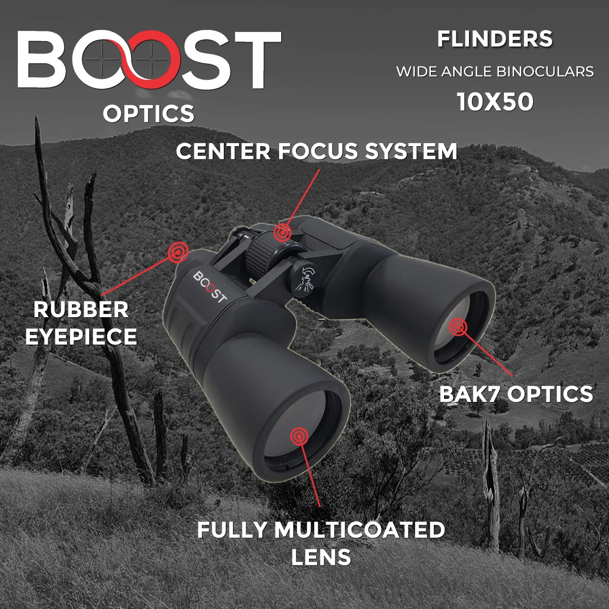 Boost Optics Flinders Wide Angle Binoculars 10×50 Made with the outdoors in mind, The Flinders 10×50 is perfect for Camping, Hiking, birdwatching and other outdoor activities. The 10x magnification and 50mm objective lens provide a clear and wide-angled view to get the most out of your surroundings. Features: Wide-angle view BAK7 optics Multi-coated lens Centre focus Specifications: Includes: Soft rubber eyepiece rain guard and objective lens covers, Durable nylon carry case, Neck strap, Cleaning cloth Magnification: 10x Objective Diameter (mm): 50mm Exit Pupil Diameter (mm): 5mm Exit Pupil Distance (mm): 9.7mm Field of view: 367ft/1000yds Close Focal Length (m): 6m Type of Prism: BAK7 Lens Coating: MC Dimension of the product (mm): 175x182x65mm Weight (g): 775g (BF-1050)