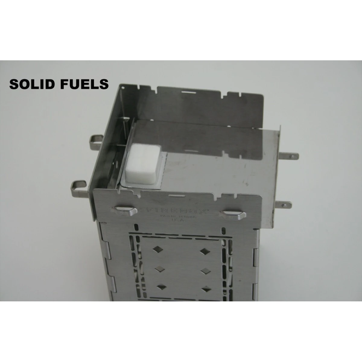 Half the weight of the Stainless Steel G2 5″ Firebox Stove. Cools much faster than Stainless Steel. Low conductivity (See below.) Much higher corrosion resistance. Multi-fuel versatility. No assembly, hinged construction (A true folding stove.) Multiple cooking configurations and multiple accessories (All SS accessories will fit Ti stove.) At half the weight, the Titanium G2 5″ Firebox Stove is very specialized for those wanting the larger size, burn performance, and amazing versatility of its heavy duty big brother which is made of Stainless Steel. Firebox has done extensive testing on this stove and have shown that its performance is better than the original Stainless Steel Firebox. The Titanium’s much lower conductivity means more heat gets reflected back into the fire for an even more efficient burn. Because this stove is so specialized Firebox wanted to make sure that it was a good fit for the market – that there were enough enthusiasts who appreciated its pure awesomeness. Therefore, Firebox is producing limited production runs of the Titanium 5″ Folding Firebox Stove. The Gen2 5″ Titanium Folding Firebox Campfire Stove is a multi-purpose super tool for fire. It’s a multi-fuel cook stove able to utilize wood and other fuels found in nature, solid fuel tablets, alcohol burners, iso-butane gas burners, gel fuels (Sterno), wood pellets or charcoal briquettes. The Folding Firebox’s larger size and sturdy construction makes it stable enough for a large dutch camp oven yet it can be used with cookware as small as a camping cup. The Folding Firebox Stove is also easy to set up. It effortlessly opens into position, and when it’s time to go it folds flat – ready to slide into your pack. Features: Multi-fuel versatility Pre-Fuelable (for less fussing with the fire) No assembly, hinged construction (a true folding stove) High heat output (Boil 2 cups as fast as 2:30min) Multiple cooking configurations, useful accessories Use virtually any size cookware Functions as a portable campfire Use the optional Trangia Gas Burner to convert the Firebox into a Gas Stove Specifications: Material: Titanium Width: 12.7 cm (5.0″) Height: 19 cm (7.5″) Folded: 0.95 cm (.375″) Weight: 413.9g (stove only) Supplied with 1 Ashpan and 2 Fire Sticks (Total 496.1g) (Ti_FB5inchStove)