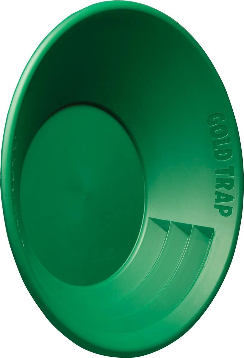 Garrett 14” Gold Trap Pan An Offset, Acentric Design Delivers Improved Performance! Garrett’s world famous Gravity Trap gold pan series has led the industry for 30 years. Garrett’s gold pans feature a 90° riffled design that ensures safe, sure, rapid gold recovery in wet or dry conditions. All Garrett pans are lightweight, green for enhanced gold nugget visibility, and virtually indestructible. Tested and proven worldwide by Charles Garrett, Roy Lagal and tens of thousands of prospectors, Garrett’s gold pans are a must for every recreational and electronic gold seeker. Don’t Lose It! Garrett’s exclusive 90 degree riffled design prevents gold from sloshing out of the pan. Features: Expands the pan’s floor size by 33%, as compared to conventional 14″ gold pans Maintains the long panning surface and optimum angle necessary for effective panning Allows gold to be driven down more efficiently to the large floor space Larger pan volume allows more material to be processed per pan Includes Garrett’s renowned riffles for trapping gold Made in USA (14GOLDTRAP)