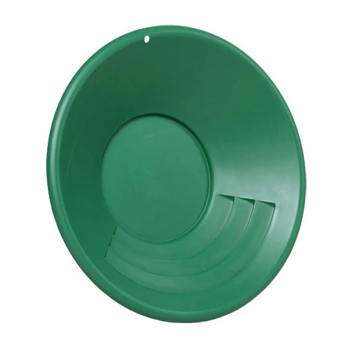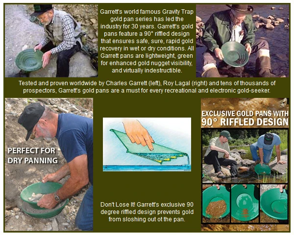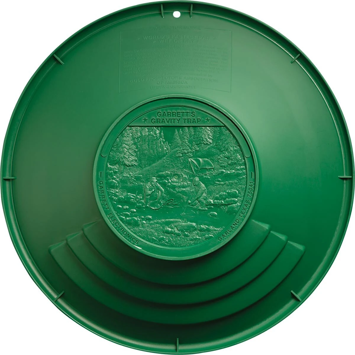 Garrett 14″ Prospector Pan Garrett’s world famous Gravity Trap gold pan series has led the industry for 30 years. Garrett’s gold pans feature a 90° riffled design that ensures safe, sure, rapid gold recovery in wet or dry conditions. All Garrett pans are lightweight, green for enhanced gold nugget visibility, and virtually indestructible. Tested and proven worldwide by Charles Garrett, Roy Lagal and tens of thousands of prospectors, Garrett’s gold pans are a must for every recreational and electronic gold seeker. Don’t Lose It! Garrett’s exclusive 90 degree riffled design prevents gold from sloshing out of the pan. Features: Great for wet/dry conditions Three 1/4″ riffles General purpose Made in USA (14PROSPAN)