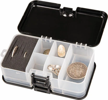 Garrett “Keepers” Find Box Protect the true “keepers” you find in the field, silver coins, delicate military buttons, fragile relics, and other items that might become scratched or damaged if left in your larger digging pouch. Keep your finds organised in this multiple compartment Keepers Box. Features Double-sided, durable plastic finds box. One compartment contains a six-slot sponge pad to protect precious coins from being scratched. Other deep compartments on top side can be filled with cotton or native soil to protect buttons and other delicate finds from being further destroyed by moisture and outside air. The reverse side of the Keepers box has shallower compartments for protecting valuable finds, one even large enough to hold a silver dollar! Includes durable latches for each compartment and loop for attaching box to belt or pack via carabiner. Specifications Weight: 130 grams Dimensions: 16cm x 9cm x 5.5cm Colour: Black and Clear (GarrettKeepersBox)