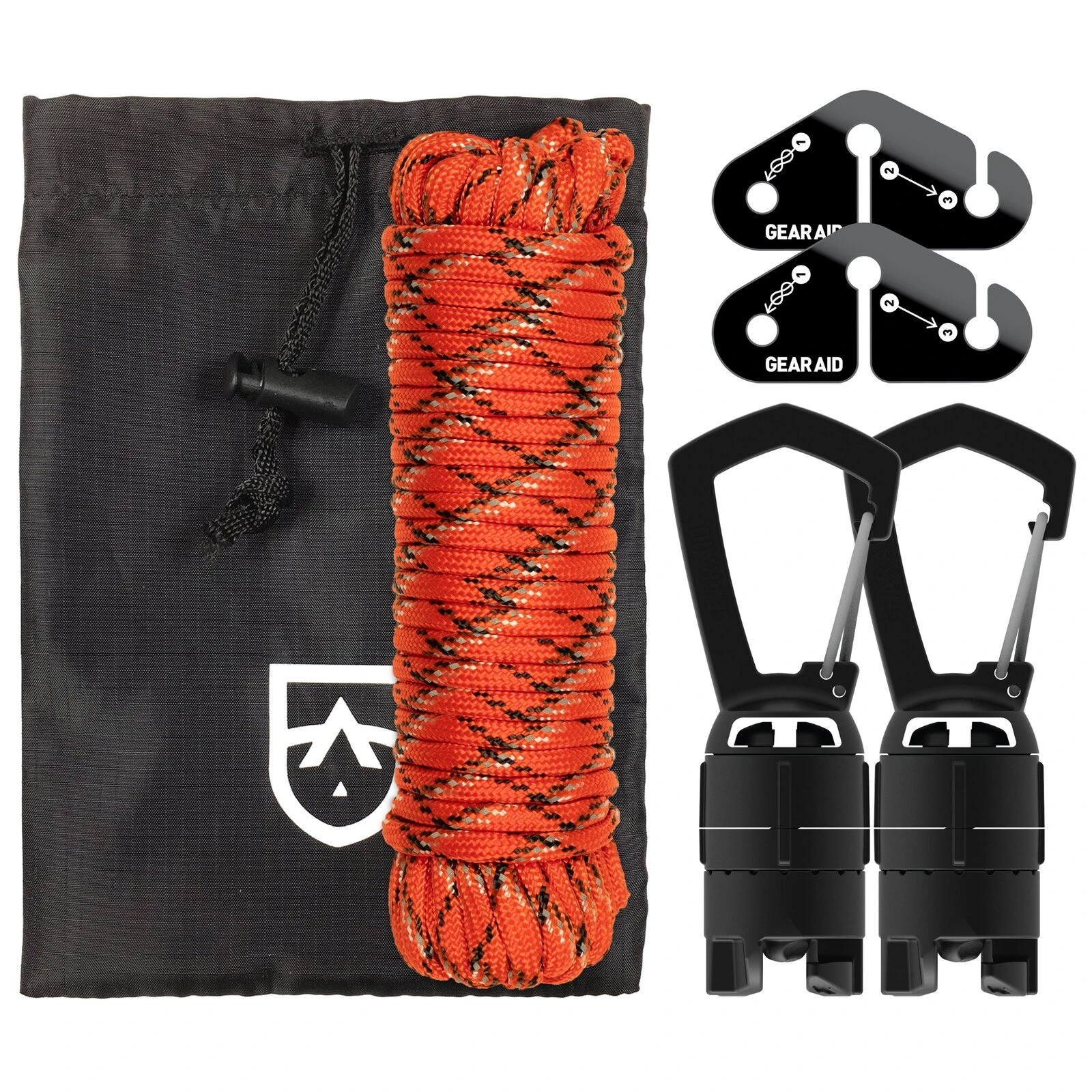 The Camp Line Kit makes drying and hanging gear quick and simple. Adventurers of all ages can set up a strong line within minutes using the included 550 Paracord, two Camp Carabiners and two Line Tensioners. With this convenient kit, drying towels, jackets and boots while on a backpacking or camping trip can be an enjoyable chore. Besides hanging gear, use it to suspend lighting, speakers and accessories above a tent or hammock for a truly unique outdoor experience. Assemble a camp line like a pro and hang gear in no time with the GEAR AID Camp Line Kit. Heavy duty, 100% nylon 550 Paracord is reflective and tough enough to handle the elements, day or night Camp Carabiner’s signature twist-and-clip design easily attaches to a 550 paracord and anchors items in place Camp Carabiner features a 1/4-20 attachment point for hanging compatible lights, speakers and electronics Line Tensioners with easy-to-follow steps and slots keep your line from sagging so gear stays off the ground Use kit components together or independently of each other to make camp organization a breeze Kit Components: 30 ft 550 Paracord 2 Line Tensioners 2 Camp Carabiners 1x Storage pouch Specifications: 550 Paracord Material: 100% nylon Carabiner Materials: stainless steel clip and nylon plastic Carabiner Dimensions: 10.5cm x 4.1cm (4.13” x 1.63”) Carabiner Weight: 34.6g (1.22 oz) each Carabiner Max Weight Load: 25 lbs. (11.34kg) each Not for Climbing (80705)