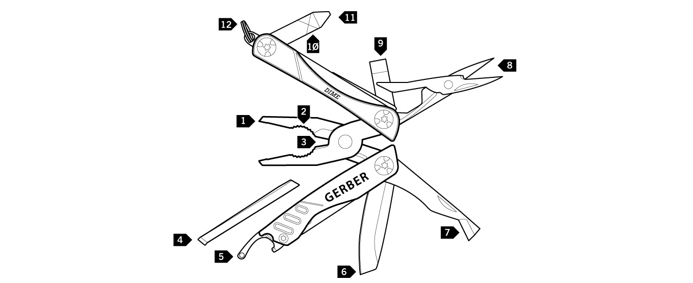 Gerber Dime Multi-tool The idea is simple: always be prepared. The Dime is a mini multi-tool with an impressive list of features, ensuring you are ready for anything. This butterfly open tool fits on your keychain yet has 12 useful tools. Available in multiple colors and a bladeless version as well. Gerber took the standard keychain multi-tool and made it better. In addition to stainless steel pliers, wire cutters, a fine edge blade, spring-loaded scissors, flathead screwdriver, crosshead driver, tweezers and file, the Dime includes a unique blade designed to safely cut and score plastic packaging and a bottle opener that is exposed even when the tool is closed. Compact and lightweight, the Dime is the most valuable change you’ll find in your pocket. Features: Spring loaded needle nose pliers Standard pliers Wire cutter Tweezer Bottle opener Fine edge blade Retail package opener blade Scissors Medium flat head driver Coarse & fine file Cross driver Lanyard ring Specifications: Overall Length: 110mm Closed Length: 71mm Weight: 62 grams (P_GERBERDIME)