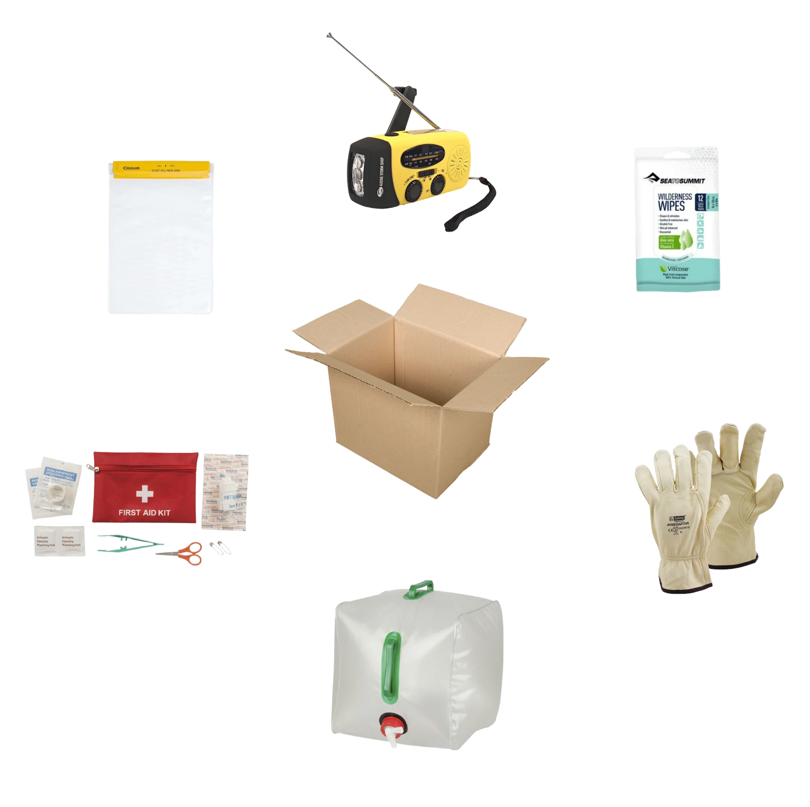 Get Ready Emergency Survival Kit 1 Person The Get Ready Emergency Survival Kit (1 Person) includes a selection of gear to help during weather events and disasters. The kit includes a waterproof document holder to keep your important documents and info dry. It has a small portable first aid kit and a pair of leather gloves to protect your hands from glass and debris if you need to evacuate. The included wind up radio has a built-in torch and can also give your mobile phone a small emergency charge. The expandable water container can be filled before a weather event to ensure there’s enough water available. Ideal for 1-2 people. This kit includes: 1x Portable Lightweight First Aid Kit 1x Waterproof Document Holder A4 Size 1x Pair of Premium Leather Cow Riggers Gloves (Let us know your glove size in the cart comments (S, M, L, XL) 1x Pack of Wipes 1x Dymamo Wind Up Torch/Radio 1x 20 Litre Expandable Water Container 1x High Visibility Day / Night Vest (Large supplied but other sizes are available) Please note: Some items may be substituted depending on availability. We can customize kits to your requirements. Contact us for more info. (GETREADY_1)
