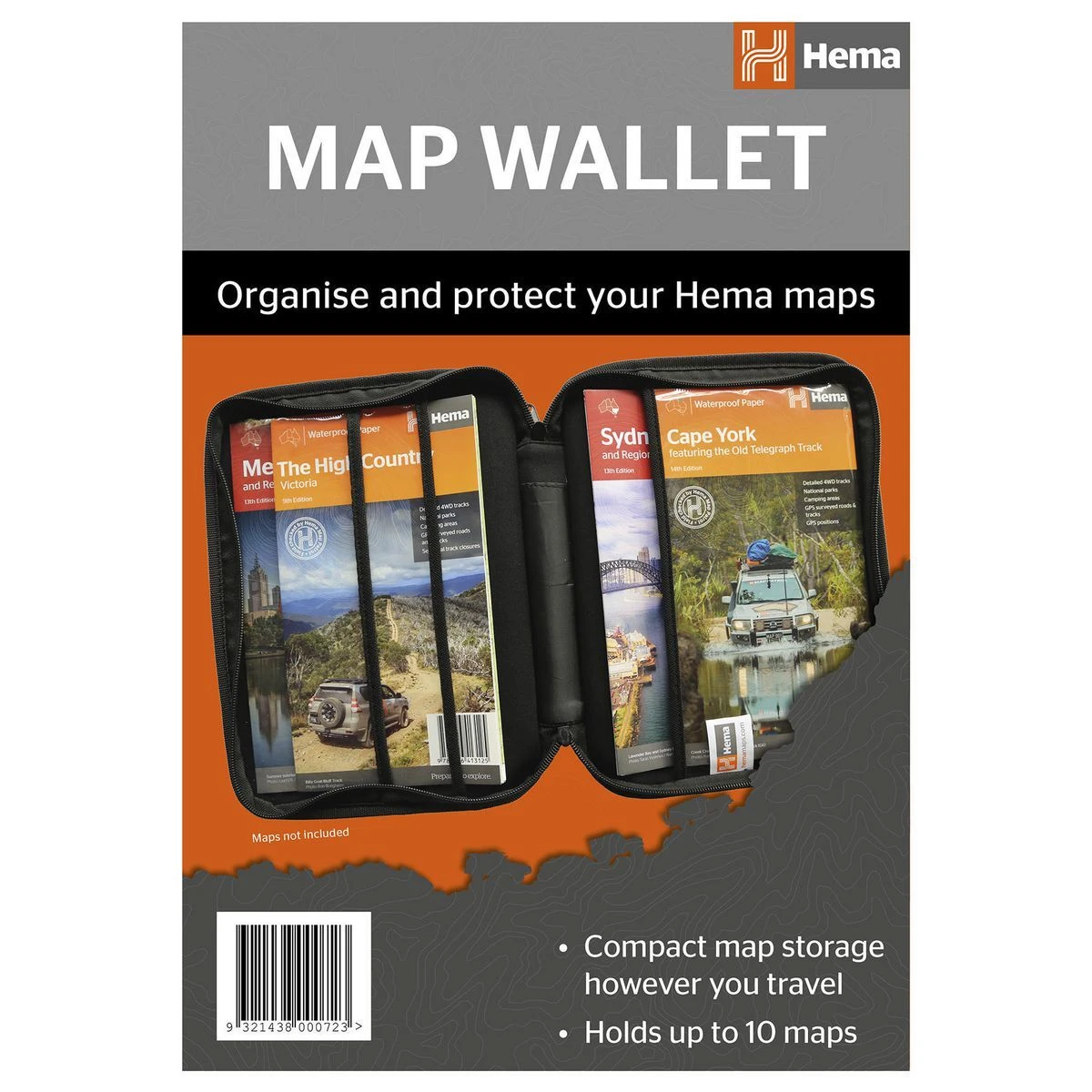 Store and protect your maps with this handy map case. Stores up to 10 maps Zippered to keep your maps clean and contained Three large clear plastic pockets keep maps tidy and easy to find Foam-lined to prevent bending or scrunching of the wallet Hema Branded This wallet is a great gift for someone about to do the Big Lap or someone who prefers maps to modern GPS. Check out our fantastic range of maps to complement the Hema map case here. (932138000723)