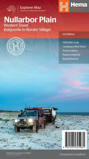 Hema Maps Nullarbor Plain Western Sheet This map is part of Hema’s new Nullarbor Plain Map Series and covers the area from Kalgoorlie to Border Village and its surrounds. Truly one of the worlds great adventure drives, Australia’s semi-arid Nullarbor Plain stretches some 1,256 kilometres via the Eyre Highway and links the cities of Adelaide and Perth (or vice versa depending on your direction). The length of this journey is so large we needed to stretch it over two maps; East from Port Pirie to Border Village in South Australia (Sold Separately) and the Western sheet from Border Village to Kalgoorlie. While all the key sites and facilities along the Eyre Highway are listed this map allows you to broaden your horizon and consider some of the other attractions off the Highway, including; the various Nullarbor caves, iconic beaches across the Great Australian Bight and thousands of kilometres of 4WD tracks (including Old Coach Road (by permit)), all field-checked by the Hema Map Patrol for superior accuracy. This map combines Hema’s entire database of roads and 4WD tracks with touring points of interest and topographic information. Also included are camping & rest areas, fuel locations, accommodation, distances and history of the region. Features 4WD tracks (including Old Coach Road) Camping & rest areas Fuel Locations Road distances Accommodation Caves and Beaches History of the area Specifications Format: Sheet Map Language: English Number of pages: 1 Published: 12th August 2021 Publisher: Hema Maps Australia Country of Publication: AU Dimensions (cm): 25.0 x 14.0 x 0.3 Weight: 90g Edition Number: 1 (625981)