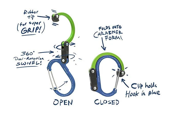 Heroclip 3-in-1 Clip, Swivel, Hook Carabiner Small THE NEXT GENERATION SUPER CLIP HEROCLIP – a fully functional clip with a rotating, folding hook – hangs or rests just about anywhere. Ideal for: Camping Hiking Home & Backyard Prams Garage + much more! Features: It is designed to free your hands so you can do more in your life It rotates 360 degrees Folds at two joints for maximum versatility Rubber tip for grip When not in use, the hook folds securely on to the clip Specifications: Holds up to 22kg (50 lbs) Dimensions: 2.4″ x 3 “(closed) Weight: 31g (1.1oz) Material: Solid aircraft grade machine-cut aluminum with anodized finish, composite, steel *Not for climbing. (HeroclipSML_P)