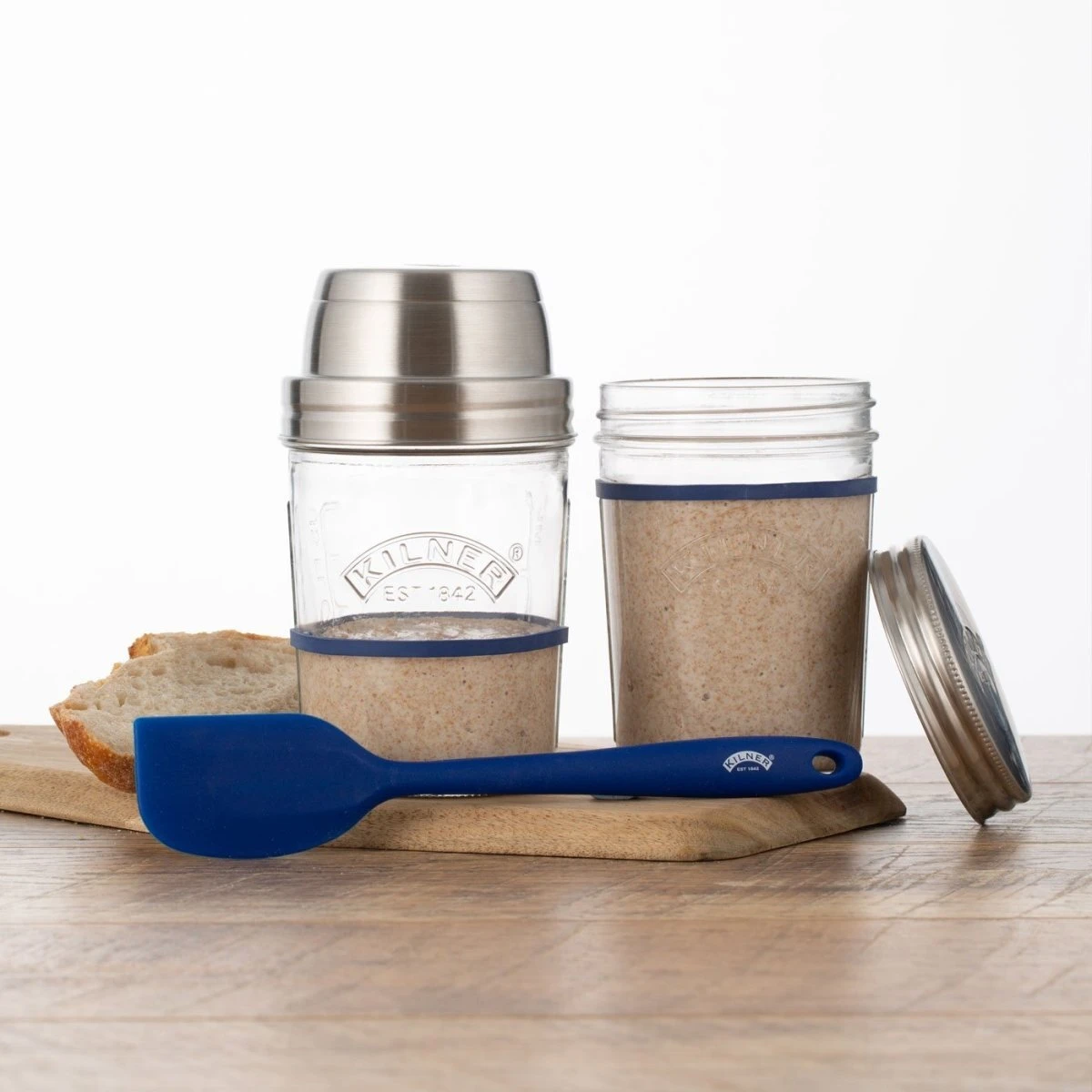 Kilner Sourdough Starter Set The Kilner Sourdough Starter Set contains all components needed to make a successful sourdough starter, which will then be used to transform into a fresh and delicious sourdough loaf. Pancakes, pizza, naan breads and other baked goods can also be made from a sourdough starter. Two jars are included in the set allowing a second batch to be created whilst the first batch is in use. The stainless steel measuring lid has been specially designed to measure out flour and water precisely, making it incredibly easy to maintain a successful starter. Included in the gift box, is a step by step booklet which includes how-to instructions. Kilner is dedicated to using sustainable and durable materials. Kilner glass is 100% kerbside recyclable and is the safest and best option for storing food and drinks. Set contains: 2 x 0.35 Litre Kilner Wide Mouth Jars 1 x Stainless Steel Measuring Lid 1 x Silicone Spatula 1 x Stainless Steel Lid 2 x Rubber Bands 6 x Labels 1 x Recipe Booklet (02244)