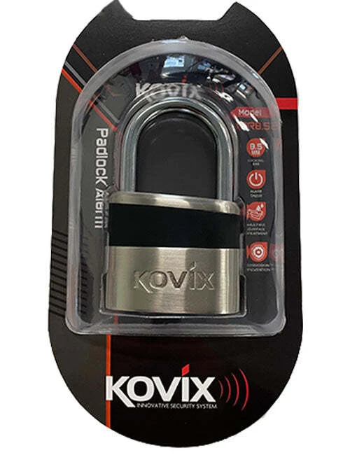 Kovix 8.5mm Heavy Duty Alarmed Padlock Secure your property with the Kovix Heavy Duty Alarmed Padlock. An ultra-tough lock, built from high-grade zinc alloy Construction with the added benefit of a loud 120db motion sensor alarm will give you peace of mind are protected. Features Durable Zinc Alloy Construction Built-in 120db Alarm System Weatherproof electronics – designed for outdoor use 8.5 mm stainless steel locking pin On and Off Alarm modes Long Life replaceable Lithium Battery Rust prevention Specifications Weight: 649grams approx Size: 8.5mm locking Bar Includes: 1x Kovix Padlock, 3x Keys, 1x Key Number, 1x CR2 Lithium Battery Battery Required: CR2 Lithium Battery (included) (KPR8.5)
