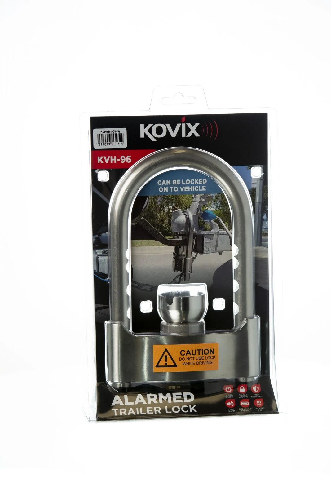 Kovix Alarmed Trailer U Lock The Kovix KVH trailer lock allows you to secure your boat, jet ski, caravan or tool trailer. Made from high strength 304 stainless steel, this lock is designed for Australia’s tough conditions. Keep thieves away with the Built-in 120db Alarms system powered by a long-life CR2 Lithium Battery. Fits most trailer coupling types. Enjoy peace of mind when leaving your boat at an unsecured boating ramp for your overnight trips, whilst camping or in your own yard. Don’t be an easy target with the Kovix range. Features Built-in 120db alarm system CR2 long-life lithium battery On and Off alarm functions Water-resistant electronics On most ball couplings, the KVH can also be locked on while the trailer is attached to your vehicle. (Refer to images) 18mm Locking Pin Rust Resistant Double Locking Fits most trailer coupling types Specifications Suitable for the following couplings: Standard 50mm ball, Standard 70mm ball, ALKO Offroad 3.5T, ALKO Offroad 2T Weight: 2.3kg approx Battery: CR2 Lithium Please Note: Do not use when driving, this can cause damage to the lock and void your warranty. (KVH96)