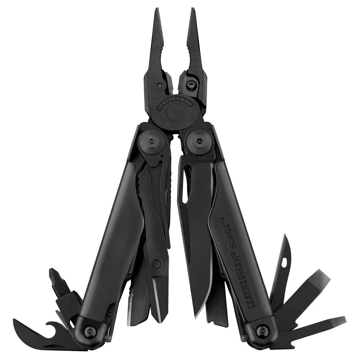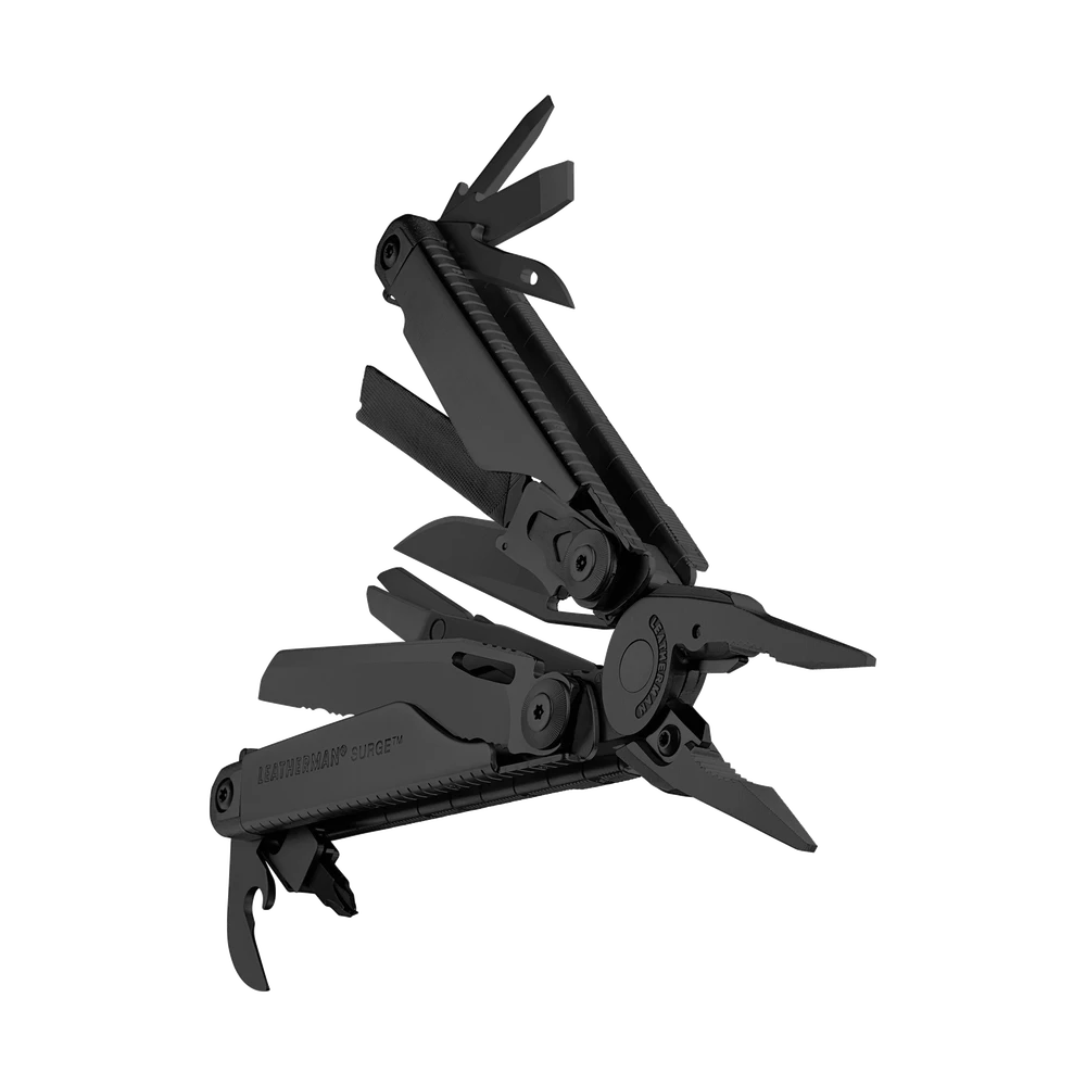 Surge Black – Model YL 831333 This heavy-duty workhorse has extra-large scissors, full-size knife blades, replaceable wire cutters and more. The Leatherman Surge is one of our two largest multi-tools, an absolute powerhouse, built with our largest pliers, longest multi-tool blades and easy-to-use locks. A unique blade exchanger, replaceable 154CM wire cutters and four outside-opening blades give you quick access to the tools you use most. The Surge was built for demanding jobs and the hands that do them. CLOSED LENGTH 4.5 in | 11.5 cm WEIGHT 12.5 oz | 335 g PRIMARY BLADE LENGTH 3.1 in | 7.87 cm Length: 11.5 cm Weight: 355 g Materials: 100% Stainless Steel/Black Oxide finish MOLLE Sheath NSN: 5110-01-541-1455 Warranty: 25 Years Bits Phillips & Flat Tip Eyeglasses Screwdriver Phillips #1-2 & Screwdriver 3/16” Tools & Blades Diamond-coated File Wood/Metal File Saw Needlenose Pliers Regular Pliers Wire Cutters Hard-wire Cutters Stranded-wire Cutters Electrical Crimper Clip-point Knife Serrated Knife Blade Exchanger Scissors Large Bit Driver Small Bit Driver 5/16” Screwdriver Awl w/Thread Loop Ruler (9 inch/22 cm) Bottle/Can Opener Wire Stripper Lanyard Ring (YL831333)