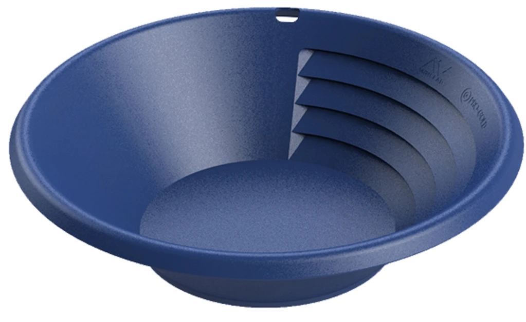 Minelab Pro-Gold 10″ Gold Pan This 10-inch pan has large 90° riffles and flat sidewall making it great for panning lighter loads and suitable for beginners and children. It’s size also makes it ideal for when you’re backpacking or trying to save space. As blue and yellow are adjacent on the colour wheel, a blue pan will help you to see gold more easily than other colours. Features: Large 90° Riffles: Large 90° riffles on this 10-inch pan catch larger gold grains before they wash away. Flat Sidewall: Final panning can be carried out on the flat sidewall, allowing you to clearly see the gold that collects in the bottom corner as it becomes separated from the remaining black sand. (3011-0327)