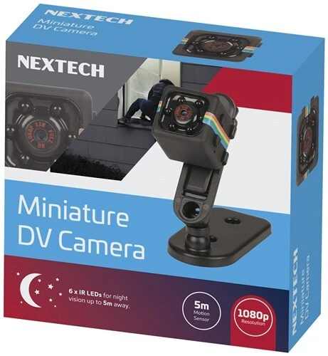 Miniature DV Camera 1080p This tiny HD digital video camera weighs only 15g and can be mounted just about anywhere to capture the action. Insert a microSD card and record 1080p HD video or easily switch to 720p to extend the storage capacity. The 140° lens provides a wide field of view of an area. A built-in motion sensor can trigger recordings when movement is detected within 5m, and six infrared LEDs enable you to record in low light. The internal rechargeable battery will run for an impressive 100 minutes of continuous recording or up to 5 hours in the motion sensing mode. To operate for longer or to charge, simply find an available USB charging port. Other features include loop recording, time/date stamp option, and a lanyard hole to help carry it with you at all times. Supplied with a mounting bracket and a cable for charging or connect to a monitor for video playback. Features: Weighs only 15g! Rechargeable 140° Wide Viewing Angle Up to 1080p Video Resolution 4032×3024 Photo Resolution 5m Motion Sensor 6 x Infrared LEDs for Low Light Conditions Up to 5 Hours of Operation in Motion Sensor Mode Specifications: Type of Memory: up to 32GB Micro SD Card (not included) Dimensions: 23mm (L), 23mm (W), 23mm (H) Weight: 15g Battery: Built-in rechargeable Lithium Ion Operation Time: 100min in contact recording mode. 5hrs in motion sensor mode Resolution : 1920 x 1080 @ 30fps Resolution Frequency: 15Hz, 30Hz Photo Resolution: 12.2MP Picture Modes: JPEG (QC8100)