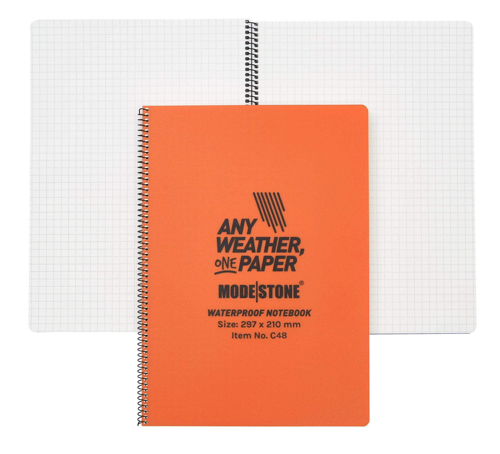 Modestone Safety Orange Side Spiral Notepad 297 x 210mm Modestone notepads are a result of long-lasting product development. The idea of waterproof notepads started while the inventor, Kalle Kinnunen was serving in Finnish Defence Forces and his important notes from NCO School were destroyed by water. First problem was to find a perfect material for the pages and the Modestone stone paper was the utmost best option. It withstands water and grease, does not tear easily and won’t get eaten by insects. Modestone stone paper has another amazing feature: it allows you to write on it with an old key or even with a bullet. This feature allows you to write in tight spots without a pen. Modestone stone paper is also an eco-friendly choice. Stone paper is made from 80% CaCo3 and 20% HDPE. Outer Colour: Safety Orange Pages colour: White Size – 297 x 210mm Page Pattern – 7x7mm grid Binding – Side wire Spiral Number of Pages – 100 Weight – 510 grams Number of Sheets – 50 (C48)