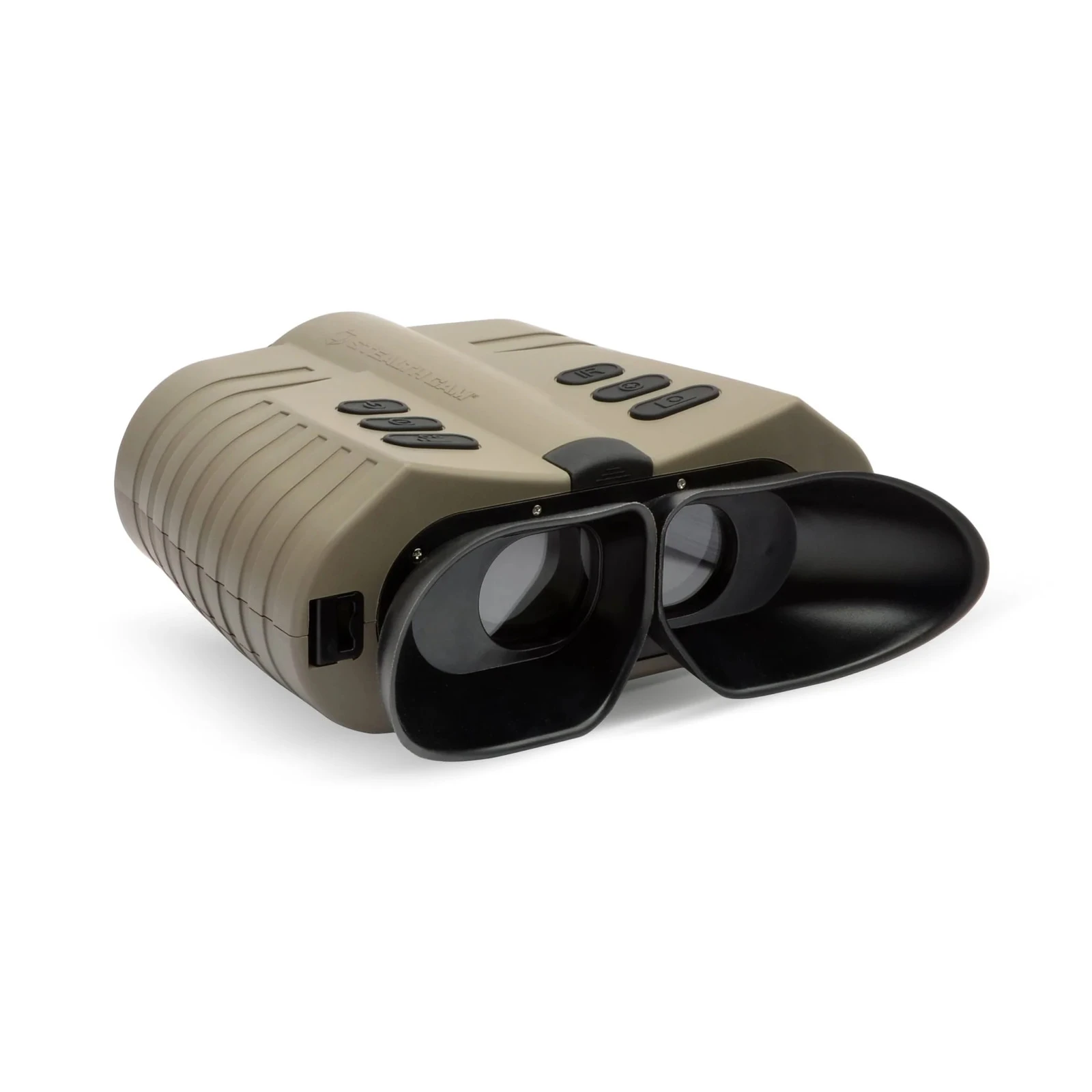 Stealth Cam Night Vision Binoculars When most are settling in for the night, some are getting the best part of their day started. Like the nocturnal species they pursue, this unique facet of outdoorsmen knows not everything slows down after sunset, that Mother Nature is at her best once night has fallen. The Stealth Cam® DNVB Digital Night Vision Binoculars light up the dark, adding color to critters as far out as 400 feet, thanks to it’s advanced low-light CMOS sensor and 1.5-inch high-resolution TFT display. With an integrated infrared filter designed for light, bright conditions and a single-watt infrared illuminator with enhanced lens geared to work under much the opposite, they’re even capable of capturing still images and video, day or night. Plus, by adjusting the frame rate to 30, 25, 15 or eight frames per second, you’re able to exert complete control over the number of images captured per second in the lens’s seven-degree field of view. Toggling the focus and inter-pupillary adjustment settings on the dual eyepieces adds crispness and clarity to your sight picture, while tuning the 9X digital zoom and 3x20mm high-quality objective lens helps you hone in on the finer details – ensuring you know everything about your target that can be gathered at a glance. And, whether you’re enjoying a calm, quiet night or braving the elements, the no-slip rubberized grip promotes a solid, steady hold as you scope out your surroundings. But, should the excitement of the evening get the better of you, don’t worry about it. Stealth Cam has wrapped these binos in rugged ABS high-impact housing that easily withstands bumps, drops and tumbles to extend the life of your trusted night-vision device. Features: Easier to use and observe with compared to Monoculars Daytime or Night time Use Up to 400 ft range at night (1300 ft daytime) 9x Digital Zoom Takes still images or video and stores them on an SD card Electronic Viewfinder F1.4 Large Aperture Infrared LED for use in complete darkness ABS durable high impact housing Non-slip rubberised grip Tripod mount compatible, with built-in base attachment Adjustable soft padded neck strap included Specifications: Viewfinder: Electronic View Finder Aspect Ratio: 4:4 Aperture: F1.4 with adjustable aperture Day / Night dual mode Distance / Range: 120m (132 yards) at Night, 400m (440yards) at Day Optical Zoom: 3x Digital Zoom: 9x Visual Angle: 10 degrees Image Capture: Both Photo and Video Luminance: IR LED / 2w External Memory: Up to 32gb TF Card (not included) Power: 6x AA batteries Dimensions: 19 x 16.5 x 6.4cm Weight: 465g Colour: Tan (STC-DNVB)