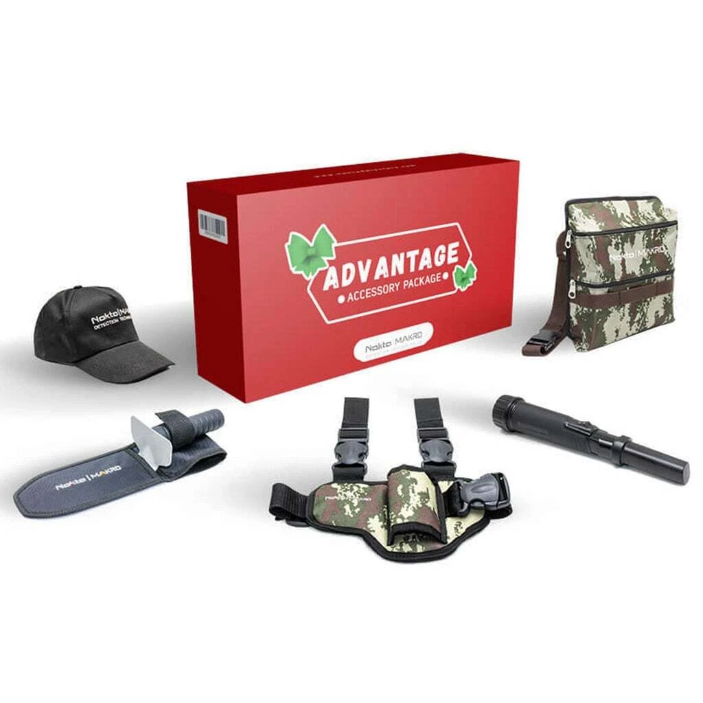Nokta Makro Advantage Accessory Package The Nokta Makro Advantage Accessory Package is the kit to get you started on your metal detecting adventures. Inside you’ll find the complete collection of important accessory items for you to go straight outside and start Fossicking. Inside the Box: PulseDive Pointer Waterproof to 60m (Waterproof IP68 rating (200ft)) Pulse Induction Built-in Wireless Module Detection Alerts & Indicators (Audio only Mode, & Vibration Only Mode & Audio+ Vibration Mode & Flashing LED Indicator) LED Flashlight Rapid Retune Dive Mode (Easier operation underwater by locking the buttons and preventing them to be pressed by water pressure while deep diving.) USB Rechargeable Lost Alarm (After 5-minutes of inactivity, the device emits an audible alarm and the LED starts flashing.) Replaceable Hard-Shell Case (Hard-shell protection case to prevent wear of the detection tip.) Premium Digger 100% Stainless Steel Includes custom belt holster sheath Two Cutting teeth Styles Rubberised Hand Grip 7.5″ Blade with cutting-edge teeth – ideal for cutting throw roots and difficult soil with ease Finds Pouch Removable & Adjustable belt (77cm – 140 cm) Thick fabric webbing for attaching your pinpointer or other digging tools Green Camo Print – Blend into your surroundings 3 Zippered Pockets & internal pocket to store good finds separate from trash PinPointer Leg Holster Easily access and Carry your PinPointer Clip it onto your belt or treasure pouch belt, then around your leg and you’re ready to move. Adjustable Size Nokta Makro Cap Help keep the harsh sun off you with this branded six panel Nokta Makro cap. Package Contents: PulseDive Pointer, Premium Digger, Finds Pouch, PP Leg Holster, Cap (N1-21111)