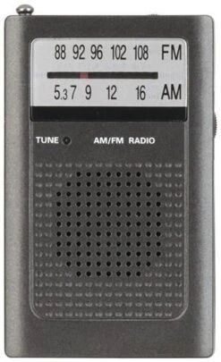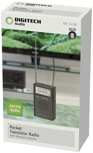 Virtually unchanged for decades. This transistor radio provides AM/FM tuning in a compact package. It features a telescopic antenna, manual turning dial, and physical frequency indicator. A 1-inch loudspeaker provides sound, or connect your favourite earphones. Features: AM/FM Selection Physical Frequency Dial Telescopic Antenna Specifications: Batteries: 2 x AAA (not included) Weight: 60g Dimensions: 89(H) x 55(W) x 19(D)mm (AR1458)