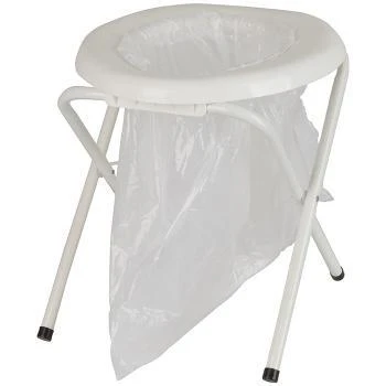 Portable Folding Toilet This unit consists of an ample plastic seat that clips onto a sturdy steel frame. It cleans with a simple hose-down and folds up for storage. Supplied with 6 replacement bags, but almost any bag, such as a kitchen tidy (medium) bag will suffice. Great for children who can be temperamental about going to the toilet outdoors. The seat will take a 90kg person. Weight Rating: Up to 90kg Dimensions: 370 (w) X 470 (L) X 50 (D) mm Includes: 1 X Portable Toilet, 6 x Replacement Bags (TPM027)