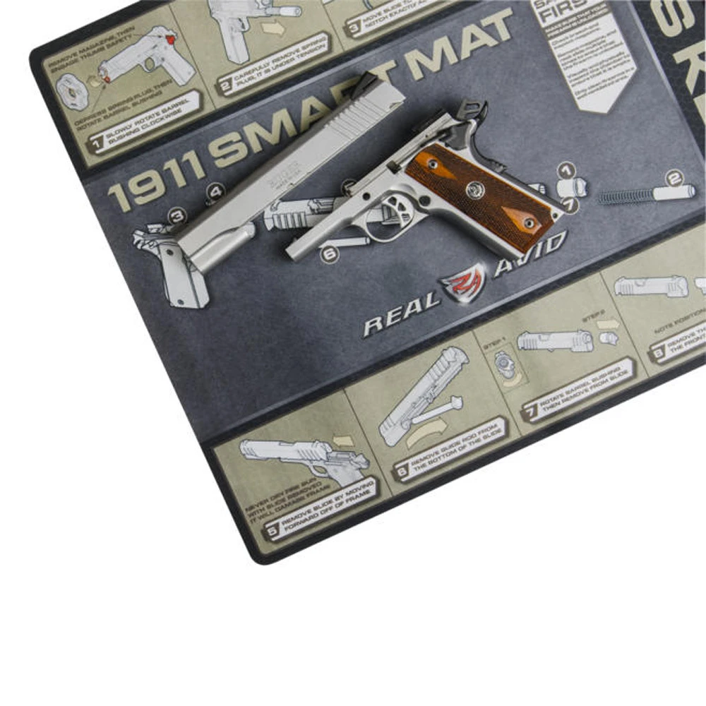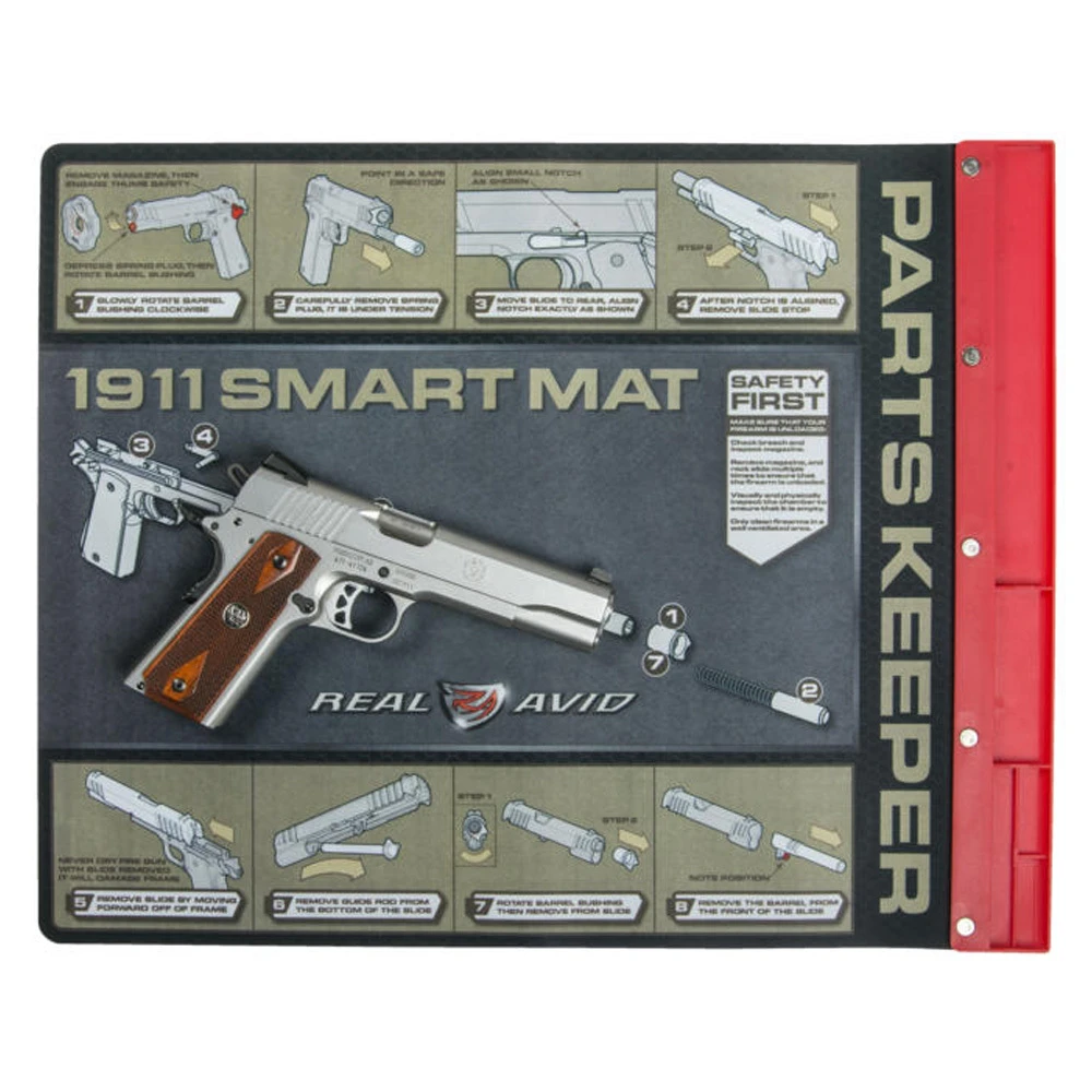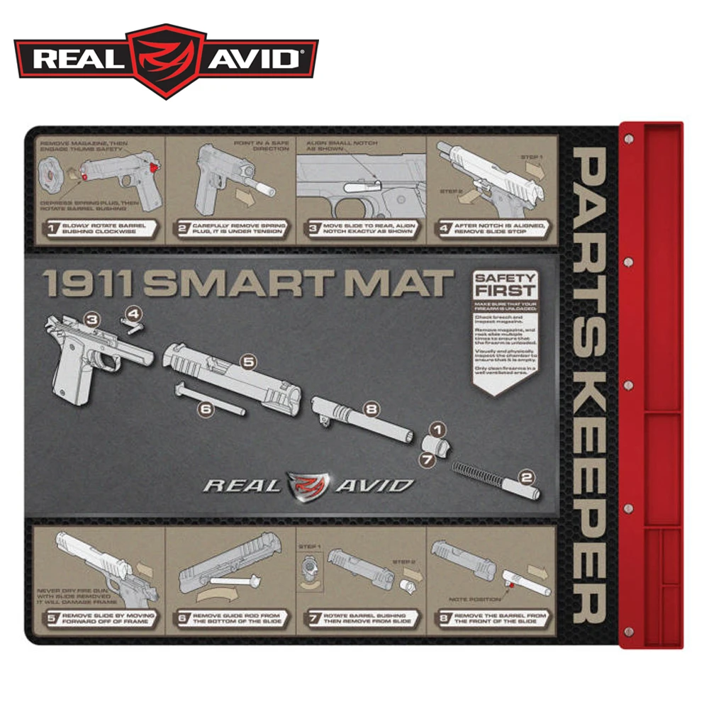 Real Avid Gun Cleaning Mat 1911 The Real Avid 1911 Smart Mat means you can properly clean your gun without ruining the kitchen table! Designed to be the ultimate cleaning mat for your favourite pistol, this padded mat is large enough to handle a field-stripped 1911 and includes an attached parts try to hold your pins, bushing, barrel and springs so they’re always safely withing reach, plus the oil-resistant surface has printed directions on how to disassemble your 1911 to make life easier. Features 482mm x 406mm Padded Cleaning Mat Parts Keeper Tray Illustrated Disassembly Instructions Oil-Resistant Work Surface Protects Work Surfaces Specifications Measurement: 482mm x 406mm Weight: 510gram approx (AV1911SM)