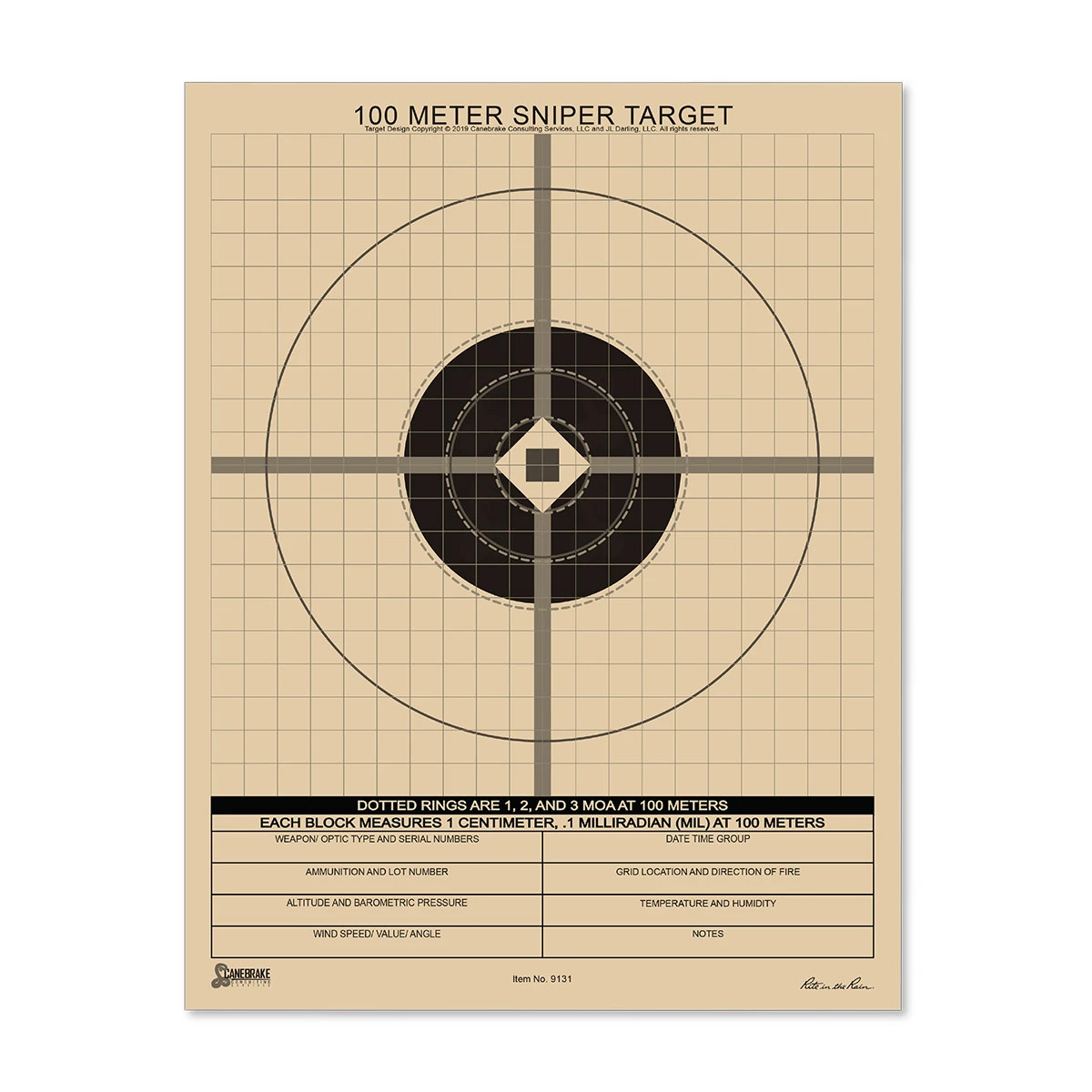 Rite in the Rain 100M True MIL Grid Sniper Target 100 Sheet Keep sharp year-round, no matter the weather, with All-Weather Rite in the Rain Zeroing Targets. Features Range Tough – Weatherproof card stock offers clean exit holes for easy evaluation of shot placement, all while surviving poor range condition Dope Form – Pre-formatted fields assist in the calculation of data on previous engagements (DOPE) Imprint Stays Put – The permanent target imprint won’t wash or rub off and the sheets separate easily even when wet Specifications Sheet size: 8.5″ x 11″ inches (216 mm x 279 mm) Paper weight: 100# heavy weight Rite in the Rain Number of sheets: 100 Imprint: 100-metre “True-MIL” grid Reference: MOA scoring rings match 100-metre sniper marksmanship evaluation criteria, large outer ring matches scoring standards for 500-yard marksmanship exercises. (9131)