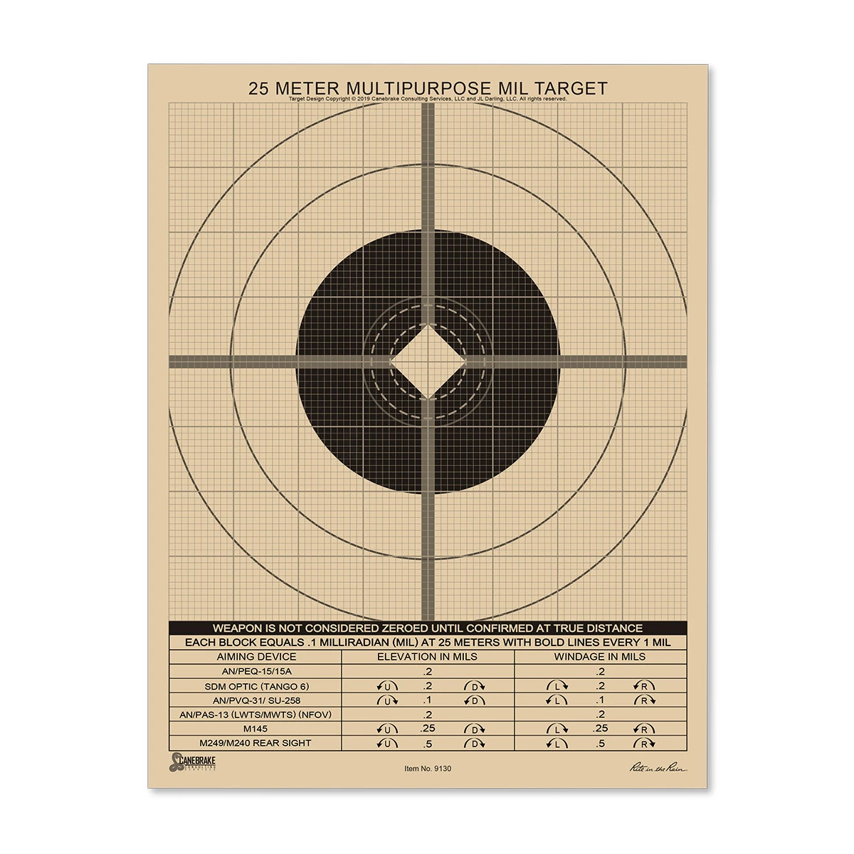 Rite in the Rain 25M True MIL Grid Multipurpose Target 100 Sheet Keep sharp year-round, no matter the weather, with All-Weather Rite in the Rain Zeroing Targets. Features Range Tough – Weatherproof card stock offers clean exit holes for easy evaluation of shot placement, all while surviving poor range condition True MIL Grid – Calculates rapid and precise values for milliradian-adjusted optics and systems. Sighting has never been easier! Imprint Stays Put – The permanent target imprint won’t wash or rub off and the sheets separate easily even when wet Specifications Sheet size: 8.5″ x 11″ inches (216 mm x 279 mm) Paper weight: 100# heavy weight Rite in the Rain Number of sheets: 100 Imprint: Multipurpose MIL 25 Meter Zeroing Target (front), blank (back) Reference: Increment and direction of adjustment for common aiming devices (9130)